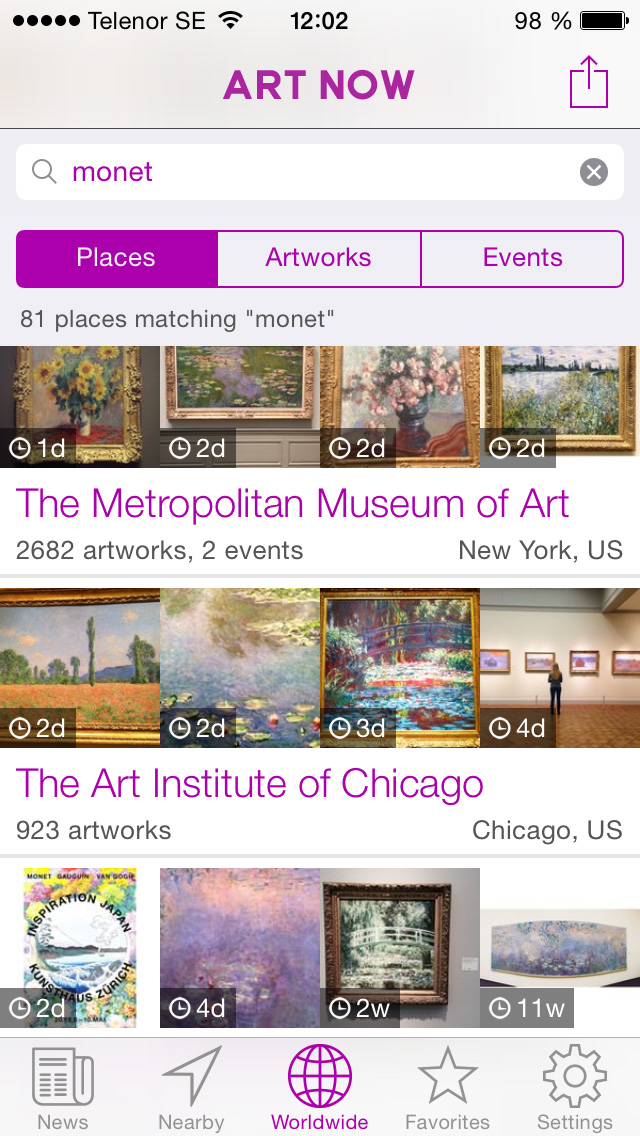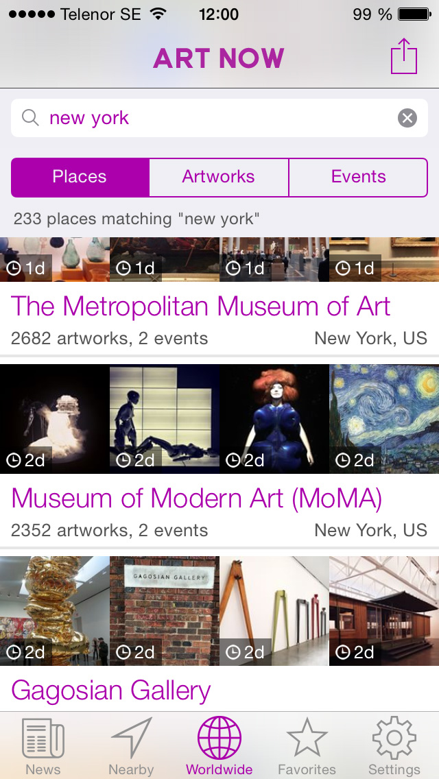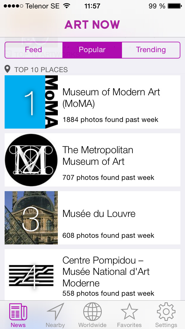 With its automated artwork search, Art Now has rapidly compiled the world’s largest database of publicly exhibited art. Using recent Instagram photos, Art Now has more updated information and greater coverage compared to similar services such as Google Art Project and Microsoft City Art Search. The Art Now app contains more than 131,000 unique artworks at 4,400 museums and galleries, searchable by artist, city, and museum. The Worldwide search can be used to find interesting museums at travel destinations. Conversely, the Nearby tab performs a proximity search inspiring visits to local museums. Art Now also features toplists of popular and trending artworks, museums, and other Instagram art aficionados.