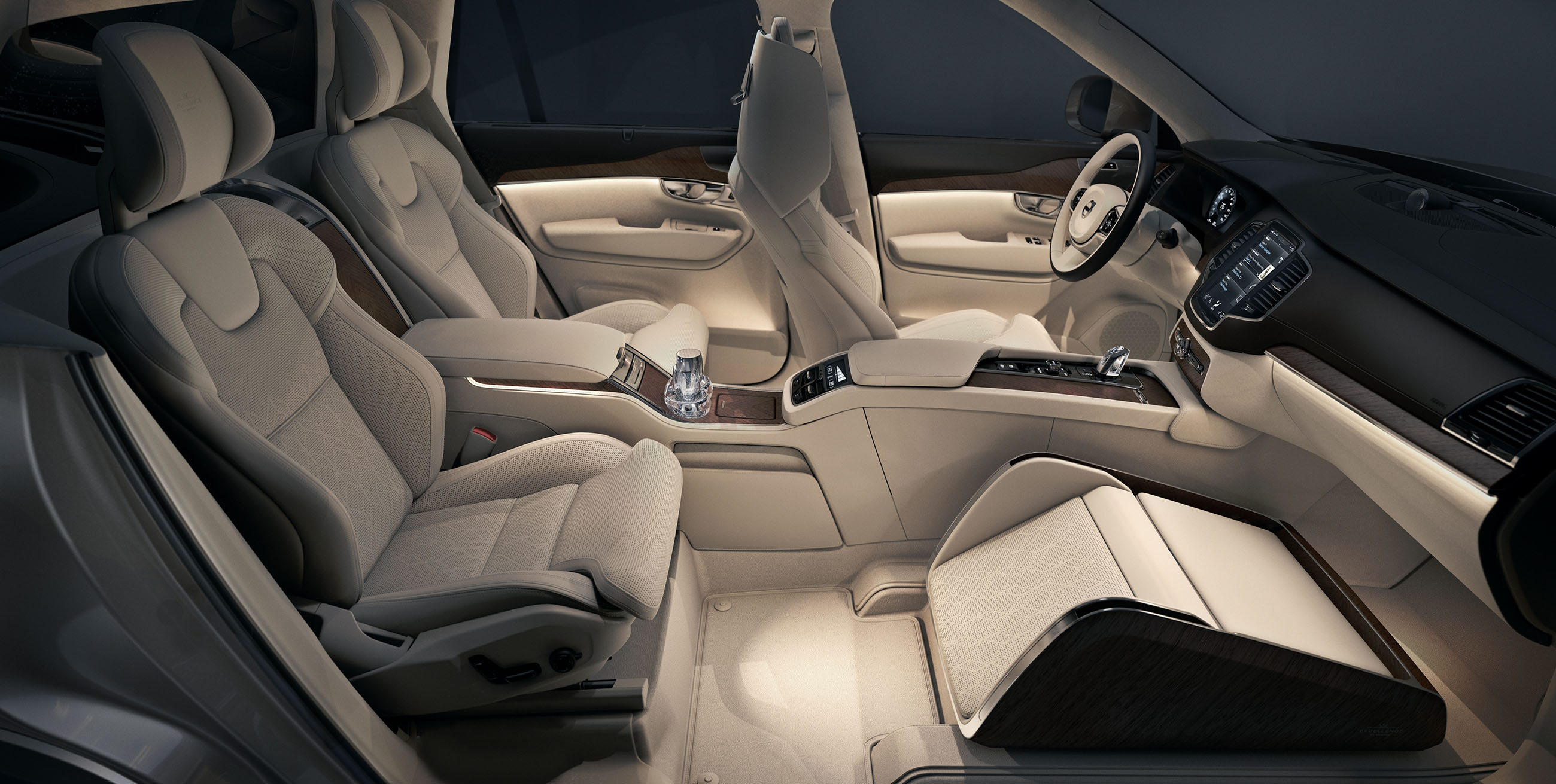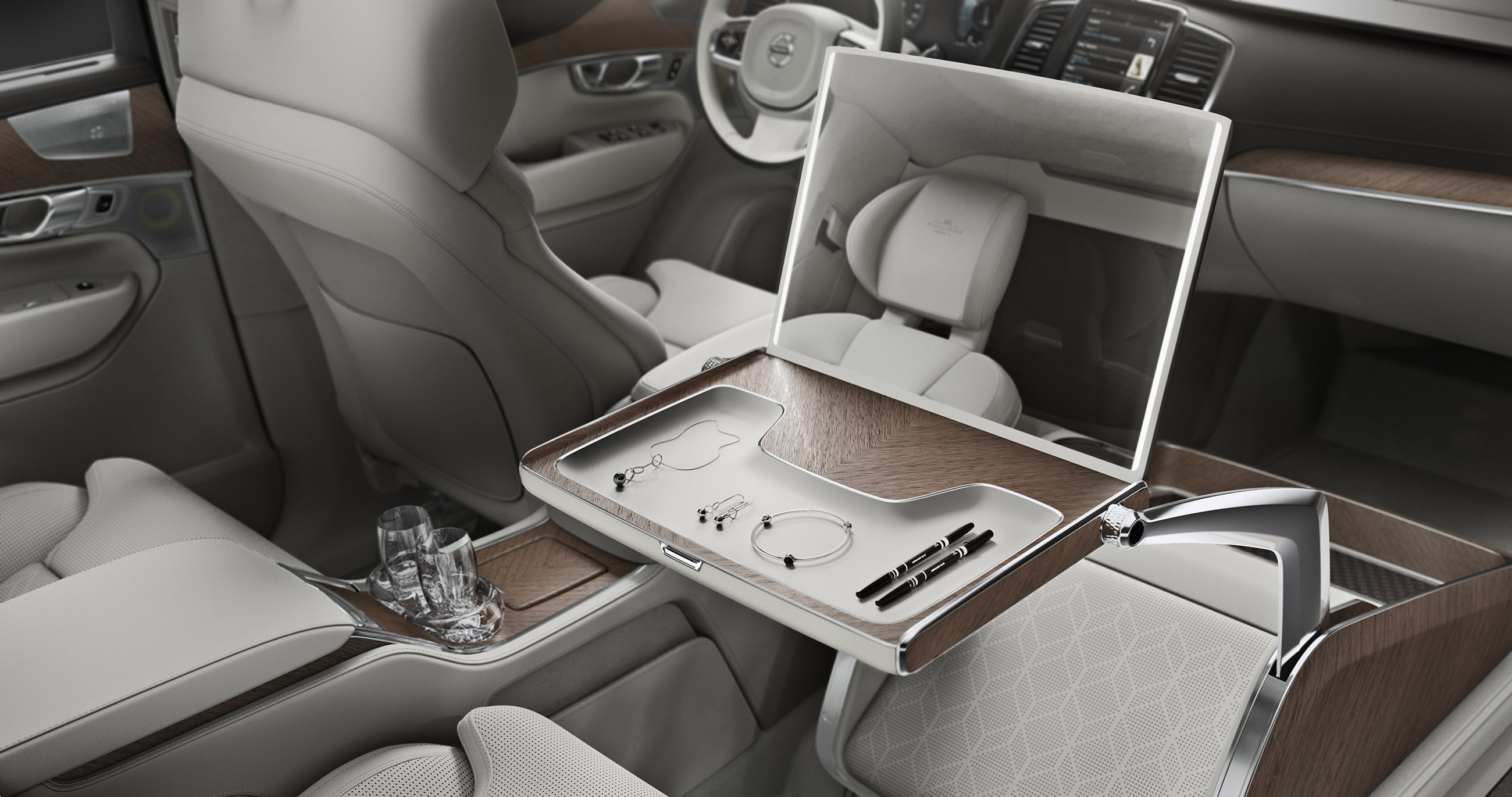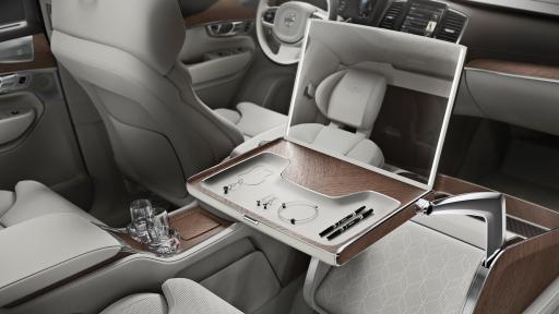 The Lounge Console incorporates features designed to enhance the in-car experience. Volvo Cars’ designers provide a large work table which opens to reveal an illuminated vanity mirror, including a storage tray for jewelry and personal accessories or make-up. The table rotates 90 degrees and simultaneously powers forward to display a large 17” media screen for a full in-car theater experience. Below the cushioned leg rest is an additional area for shoes. For added security Volvo Cars has included a lockable storage box. The removal of the front passenger seat allows for full forward vision creating a uniquely spacious environment.