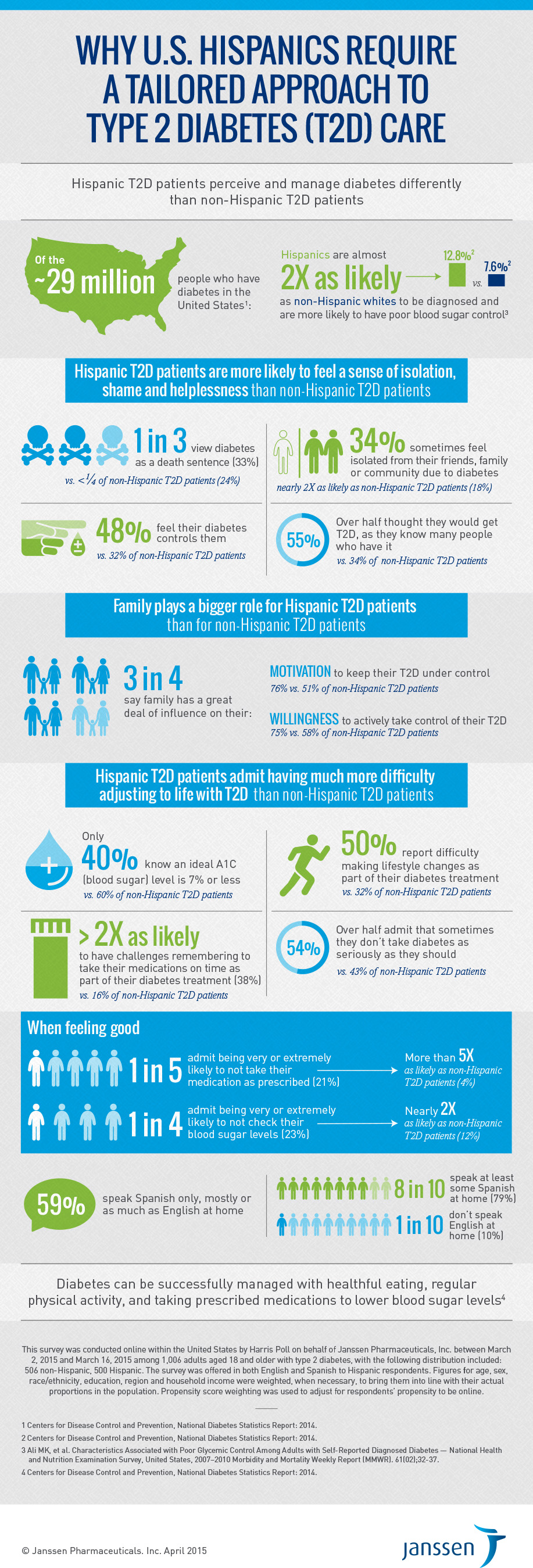 The Hispanic insights survey was conducted online within the United States by Harris Poll on behalf of Janssen Pharmaceuticals, Inc. between March 2, 2015 and March 16, 2015 among 1,006 adults aged 18 and older with type 2 diabetes, with the following distribution included: 506 non-Hispanic, 500 Hispanic. The survey was offered in both English and Spanish to Hispanic respondents. Figures for age, sex, race/ethnicity, education, region and household income were weighted, when necessary, to bring them into line with their actual proportions in the population. Propensity score weighting was used to adjust for respondents’ propensity to be online.