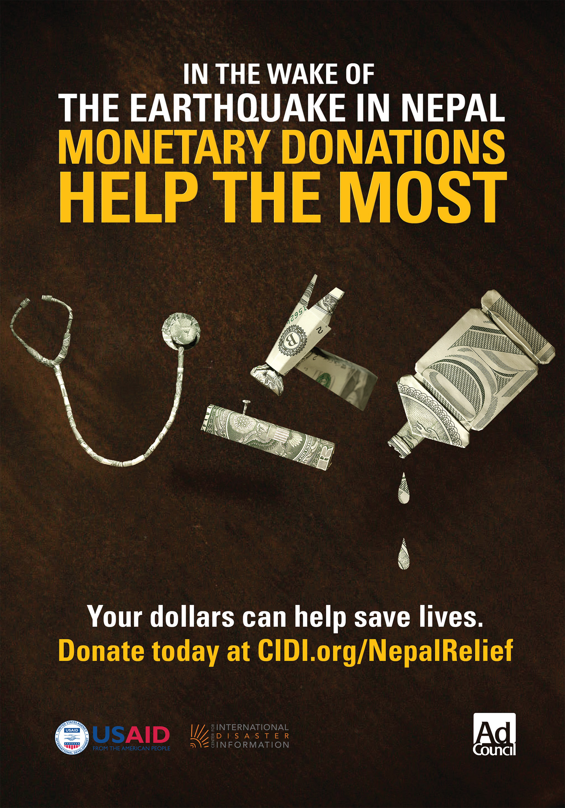 “The most substantial, expeditious, and effective way to help those affected by disaster is to give a monetary donation to a relief organization that is already working to provide aid to those in need,” said Juanita Rilling, Director of USAID’s Center for International Disaster Information. “USAID CIDI is proud to be working with the Ad Council to ensure this important message reaches all Americans who want to help.”