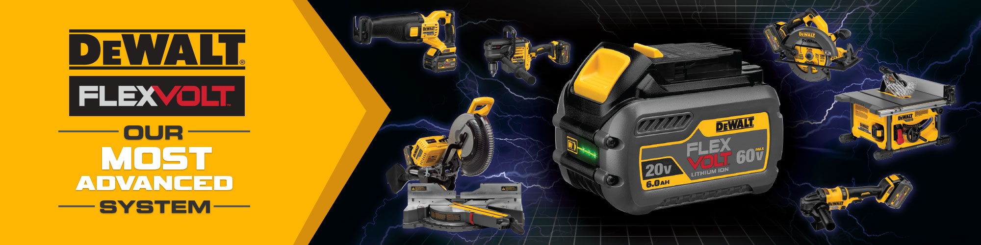 Both the 6.0Ah & 9.0Ah batteries will extend the runtime of existing DEWALT 20V MAX* tools, and also power five new 60V MAX* tools and two new 120V MAX* tools (with 2 FLEXVOLT™ batteries). The new 60V MAX* FLEXVOLT™ brushless tools include a 7-1/4” Circular Saw (DCS575), 4-1/2”-6” Grinder (DCG414), Reciprocating Saw (DCS388), 1/2" VSR Stud and Joist Drill (DCD460), and 8-1/4” Table Saw (DCS7485). The new 120V MAX* FLEXVOLT™ tools are a 12” Fixed Head Compound Miter Saw (DHS716) and 12” Sliding Compound Miter Saw (DHS790).