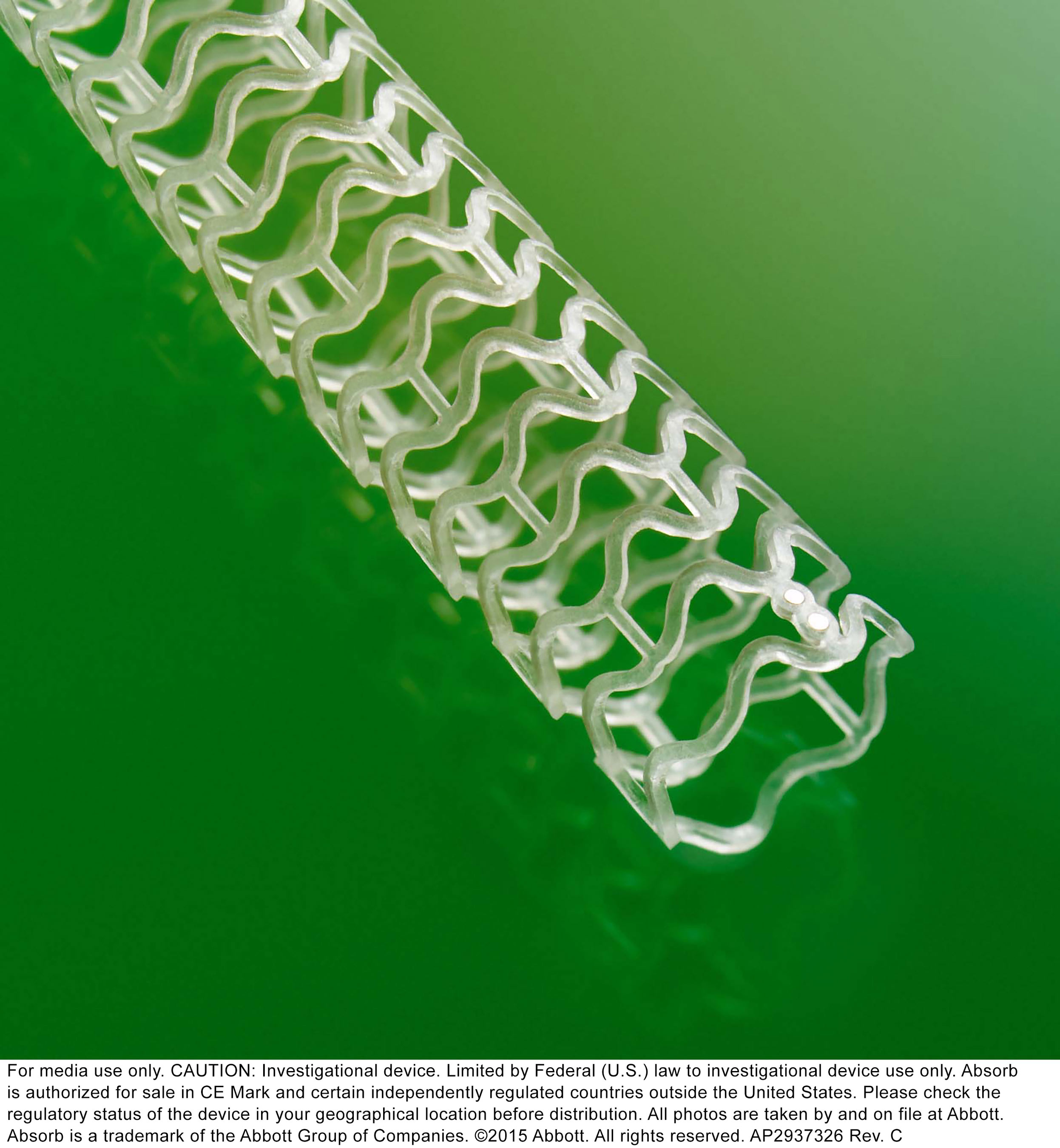 Absorb is a first-of-its-kind device that functions like a metallic stent by opening a blocked artery in the heart and restoring blood flow. However, unlike a metallic stent, which cages the vessel, Absorb is more flexible and dissolves over time, leaving behind a treated vessel free of a permanent implant with the potential to flex, pulse and dilate in response to various demands on the heart, based on people’s lifestyle and activities, such as exercise.1,2