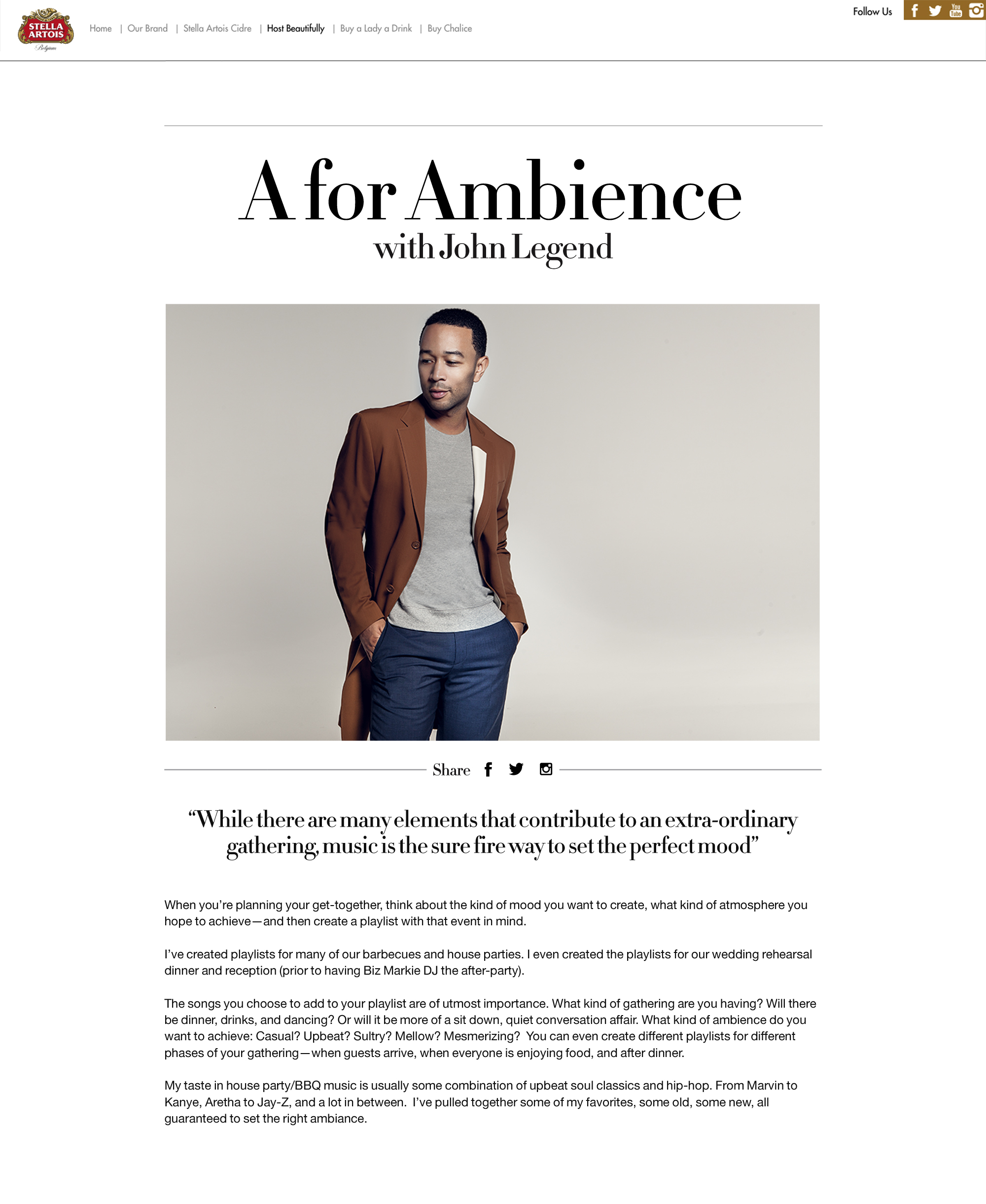“As a brand of beauty and tradition, only Stella Artois, with its Nine Step Pouring Ritual, full flavor and unique Chalice, can elevate any occasion from ordinary to extraordinary,” said Ricardo Marques, Vice President of High End Marketing at Anheuser-Busch. “Music is a key component to any social gathering, so it was only natural we tapped John Legend to set the mood for our celebration. He’s not only the voice of his generation, but also is known for hosting amazing summer parties.”