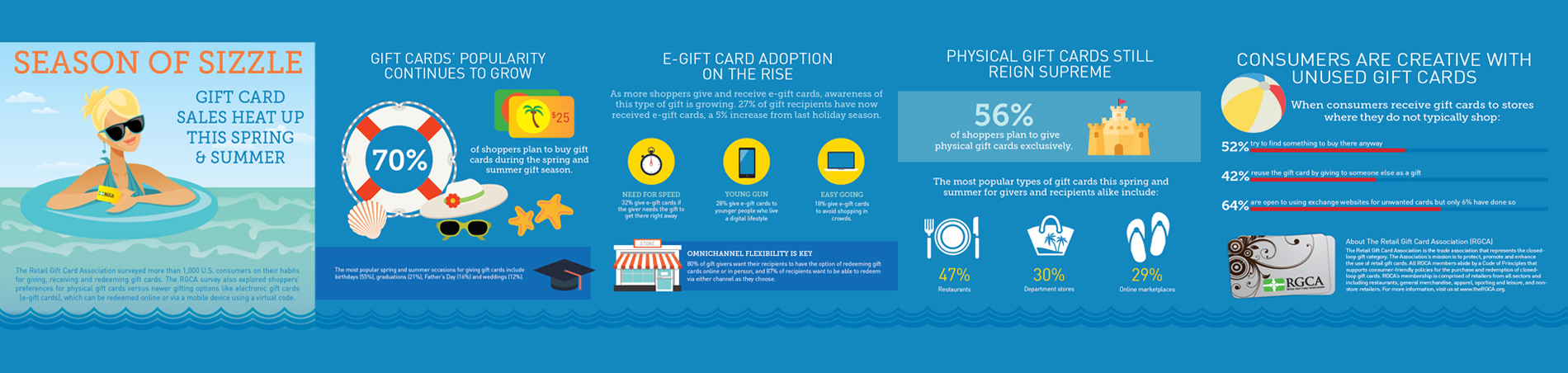 “Large-scale retail trends, like movement towards omnichannel and increasing awareness of digital offerings, continue to be reflected in consumers’ use of gift cards,” said Timm Walsh, RGCA Chairman of the Board. “And our biannual research has confirmed again that shoppers still consider gift cards to be safe, preferred gift choices. This spring and summer season should bring increased sales of this favored gift product.”