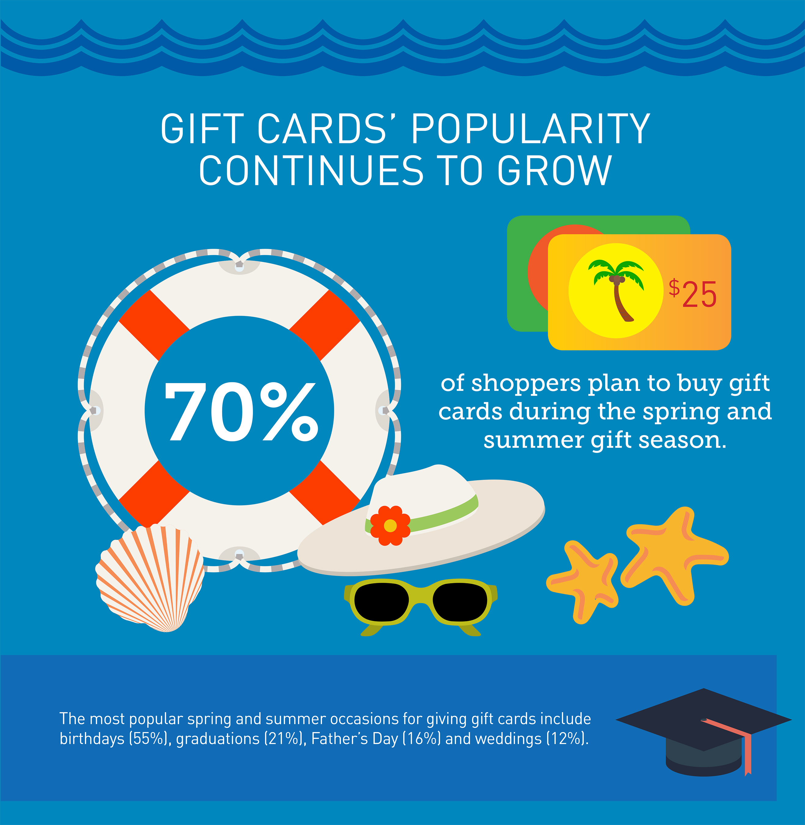 More than 70% of shoppers will be giving gift cards this spring and summer during the assortment of gift-giving holidays that are approaching, including graduations, Father’s Day, and weddings. New research from the Retail Gift Card Association (RGCA) also confirms that the gifts remain popular with recipients as well, with 95% of consumers hoping to receive gift cards this spring and summer season.