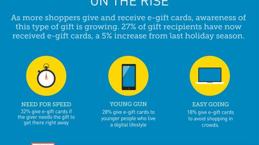 - Awareness of e-gift cards is growing: As more shoppers receive e-gift cards, the awareness of this type of gift is growing. 27% of gift recipients have now received e-gift cards, a 5% increase from last holiday season. The top reasons shoppers want to give e-gift cards include when the giver needs the gift to get there right away (32%), when giving to younger people who live a digital lifestyle (28%), or to avoid shopping in crowds (18%). 40% of shoppers would consider buying them as gifts this spring and summer.