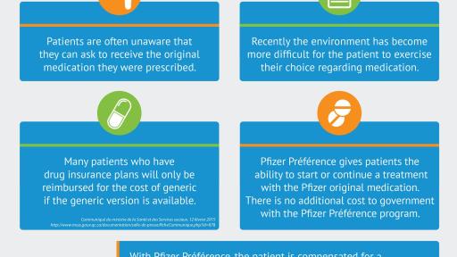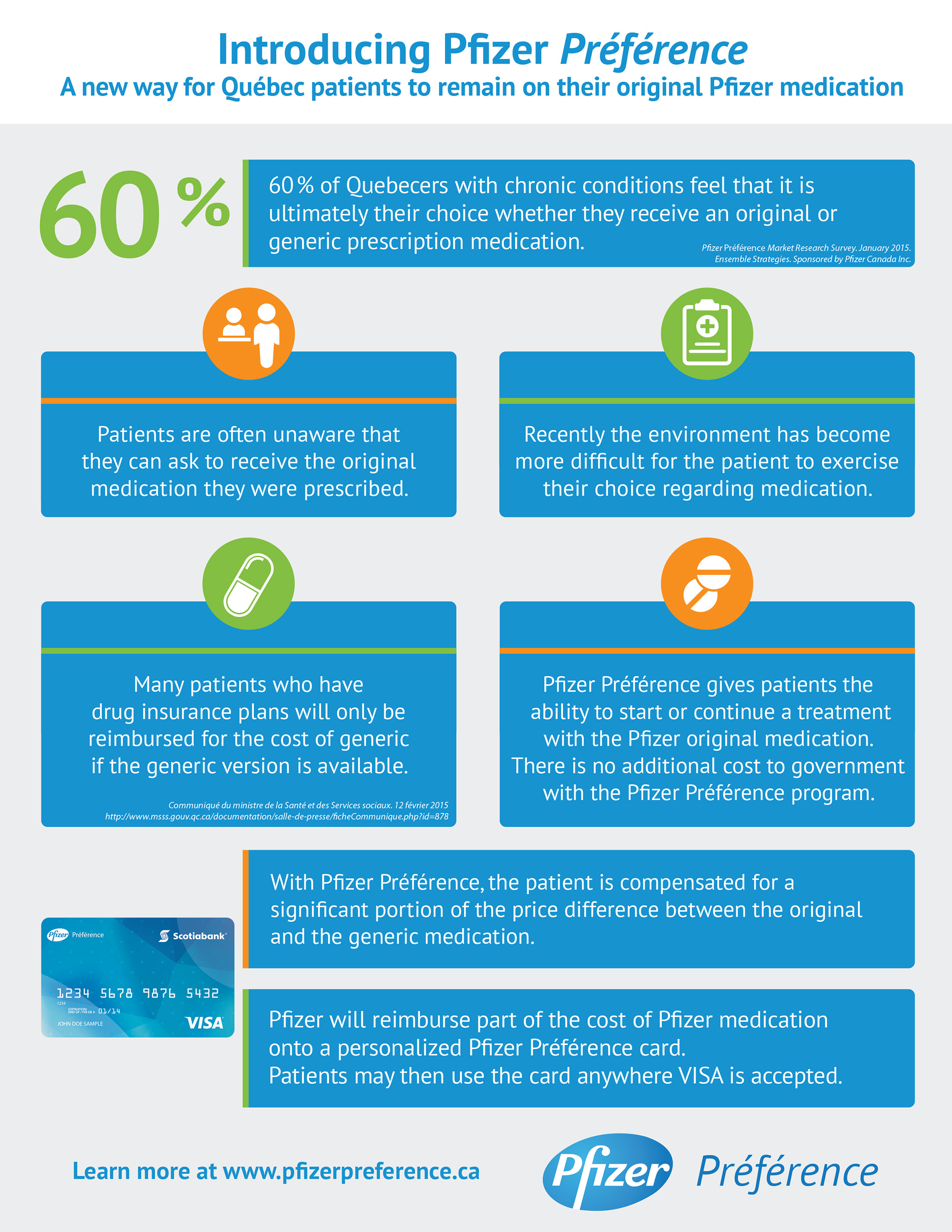 CNW, Kirkland, June 16, 2015 – Pfizer Canada is proud to introduce Pfizer Préférence, a new program available to Quebec patients which covers a significant portion of the price difference between the generic and original version of certain Pfizer medications.