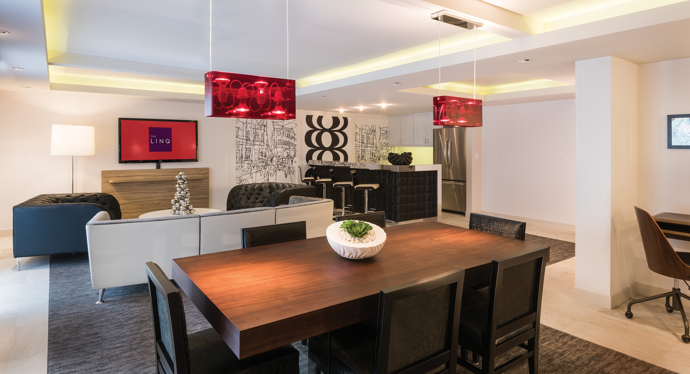 The LINQ Hotel & Casino offers two distinct Penthouse Suites, designed as a millennial retreat with simplified palates, almost as if the room had an Instagram filter applied to it. Both spanning more than 1,000 square-feet, the Penthouse Suite offers sleek, modern furnishings, eclectic artwork and pops of bright colors. Each urban loft-inspired suite features a large living room, powder bath, kitchenette with microwave drawer and full-size refrigerator, bar with seating for four, dining room table for six, and a king bedroom with dual vanity bathroom complete with rain shower, microfiber robes and slippers. The penthouse includes Bose® speakers, record players with a cool selection of vinyl records and in-room board games like glow-in-the-dark chess to keep you and your closest friends entertained for hours.