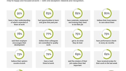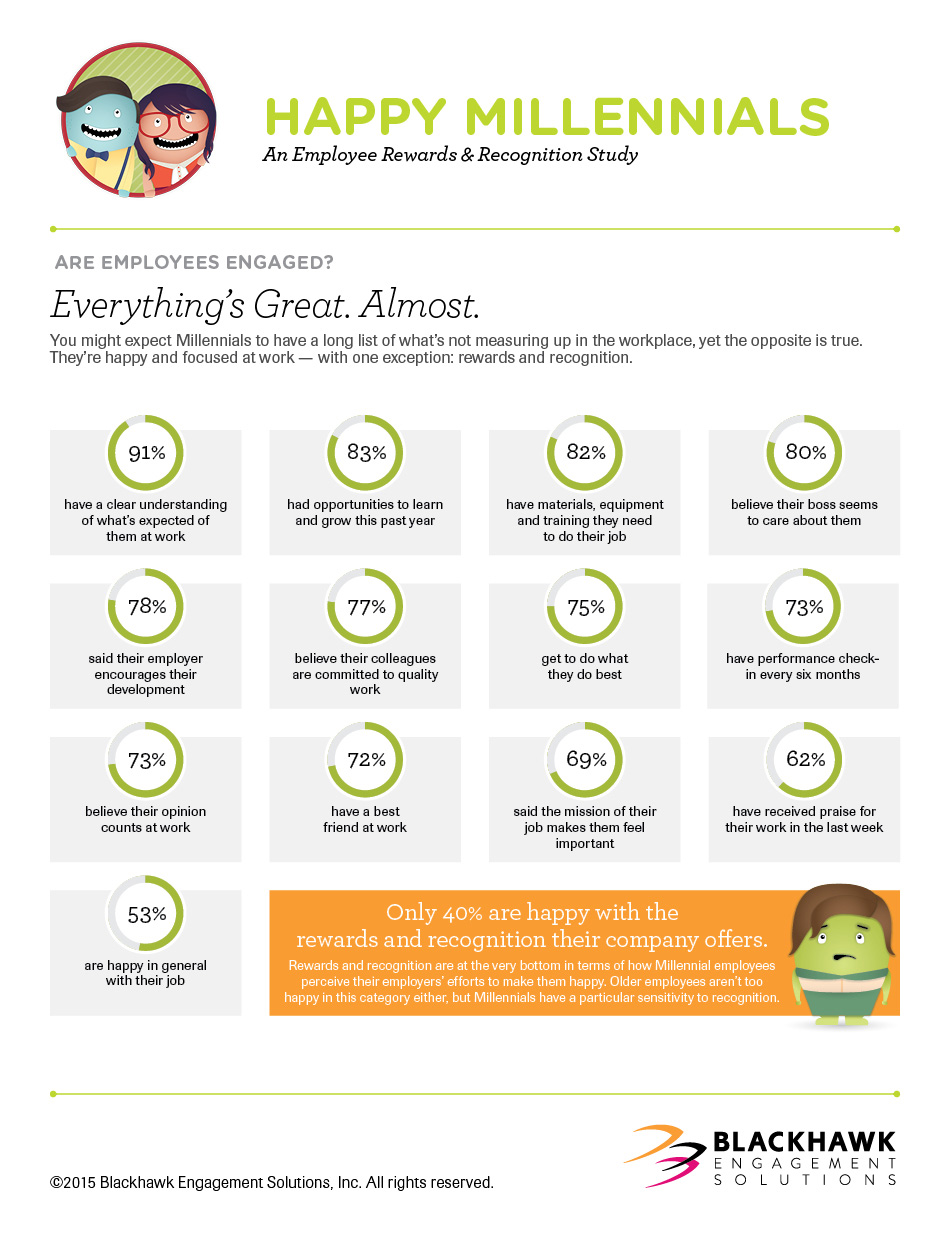 - Millennials are happy and comfortable at work—except with rewards and recognition: Employers may expect Millennials to have a long list of what’s not measuring up in the workplace, yet the opposite is true. Millennials are engaged at their jobs, with the majority having a clear understanding of what is expected of them, opportunities to learn and bosses who seem to care about them. However, only 40 percent are happy with the rewards and recognition programs that their companies offer, and 39 percent say their employers don’t offer any rewards or recognition.