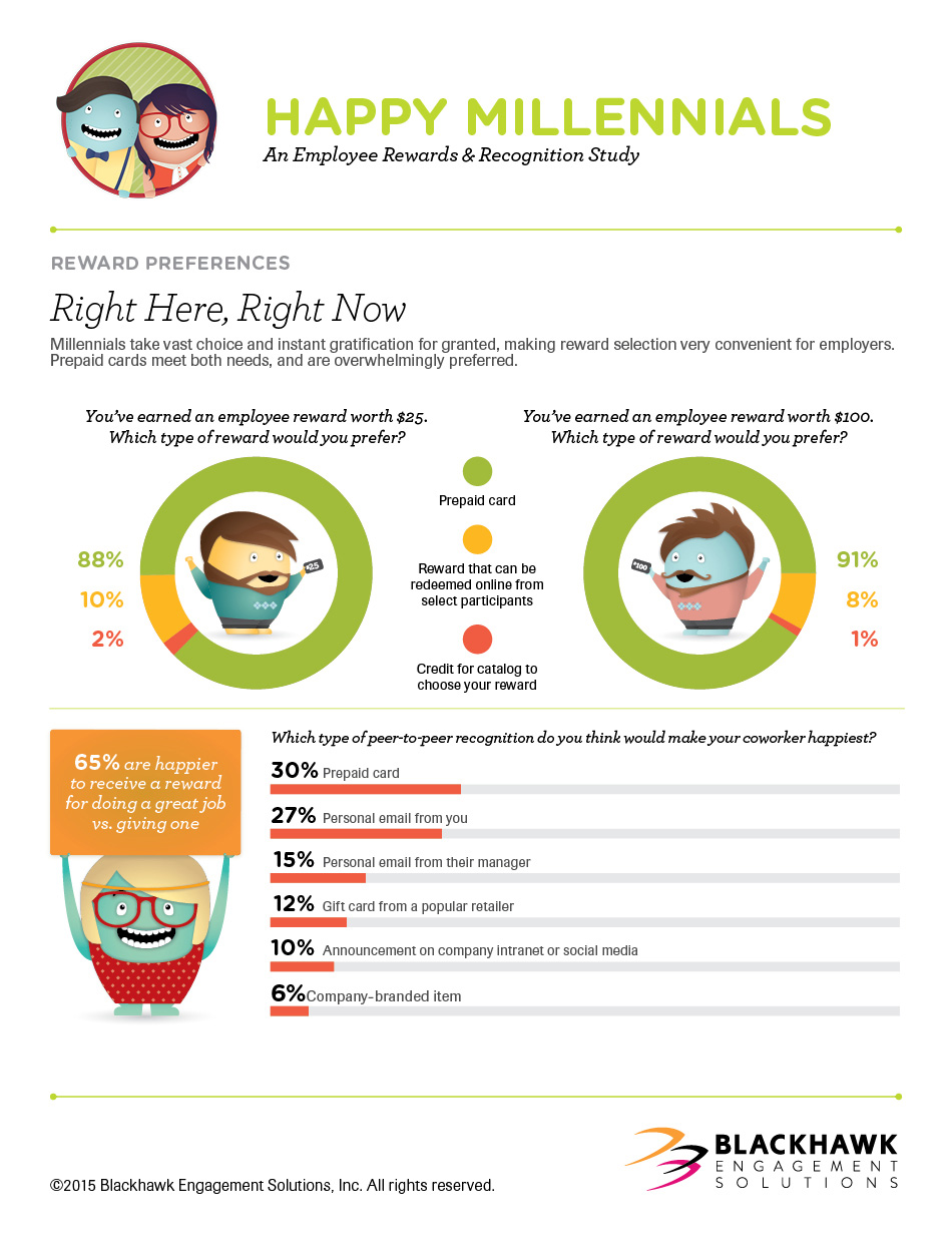 “Millennials are accustomed to attention and praise from their earliest days, and expect regular affirmation in the workplace. They are also prepared to switch jobs earlier and more frequently than previous generations, so employers need to take particular steps to maintain Millennial engagement,” said Rodney Mason, GVP of Marketing with Blackhawk Engagement Solutions, an international incentives and engagement company. “All-expense-paid trips and tickets to sporting events have little appeal for Millennials. Instead, they want more immediate and consistent recognition for their professional contributions and love the immediate gratification of prepaid card rewards.”