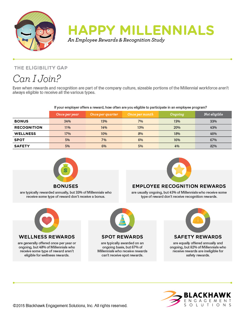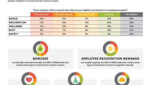 - Many Millennials are not eligible for rewards: Even when rewards and recognition are part of the company culture, sizeable portions of the Millennial workforce are not eligible to receive them. Safety rewards are not available to 82 percent of Millennials; spot rewards aren’t given to 67 percent; and wellness rewards are not available to 48 percent.