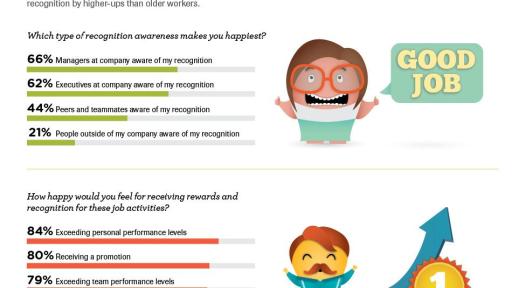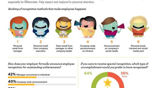 - Affirmation is key to Millennials’ happiness: Millennials expect and respond to personal attention. Sixty-four percent of Millennials would prefer to be recognized for a personal accomplishment, as opposed to a team accomplishment. They also prefer recognition directly from a manager or via a companywide announcement, versus peer-to-peer. When asked what they most wanted recognition for, 85 percent of Millennials want to be rewarded for exceeding personal performance levels, 80 percent for receiving a promotion, and 79 percent for exceeding team performance levels.