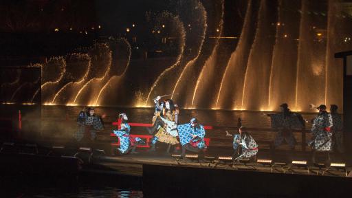 - Music – New music was composed for this performance and recorded by musicians in Japan. As the scene transitions from spring and summer to autumn, the Fountain will display a sweeping art form in sync with the beautiful melody of the Shamisen, a Japanese three-stringed musical instrument. Traditional Takemoto chanting will bring the music to a dramatic climax for Somegoro’s fight scene with the carp.