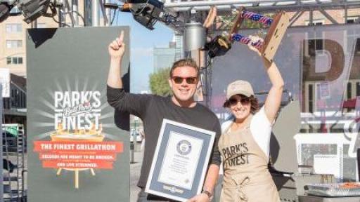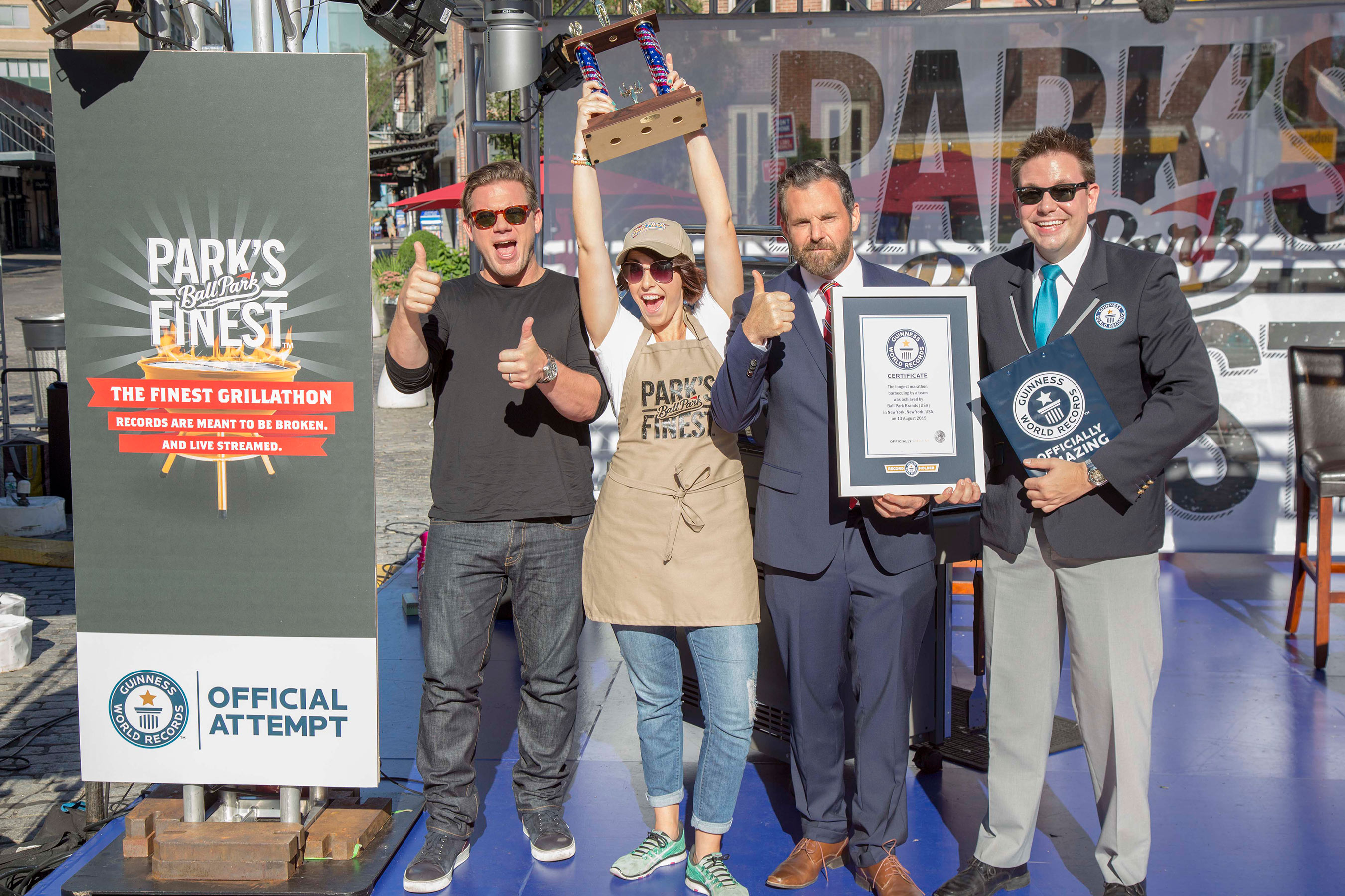 More than 3,200 Ball Park Park’s Finest™ frankfurters later, a new GUINNESS WORLD RECORDS title was set for the Longest barbecue marathon by a team as the Ball Park® brand grill team, led by Food Network celebrity chef Tyler Florence and two consumer contest winners, grilled for 34 hours and 35 minutes straight, shattering the existing 30 hour record. The non-stop “Finest Grillathon” unfolded in New York City’s Gansevoort Plaza, where consumers tuned in via livestream on www.BallParkBrand.com or the social media app Meerkat to watch Florence and team go the distance. GUINNESS WORLD RECORDS officials chronicled the Ball Park brand challenge, a history-making maneuver that was previously set by a bunch of British blokes earlier this year.