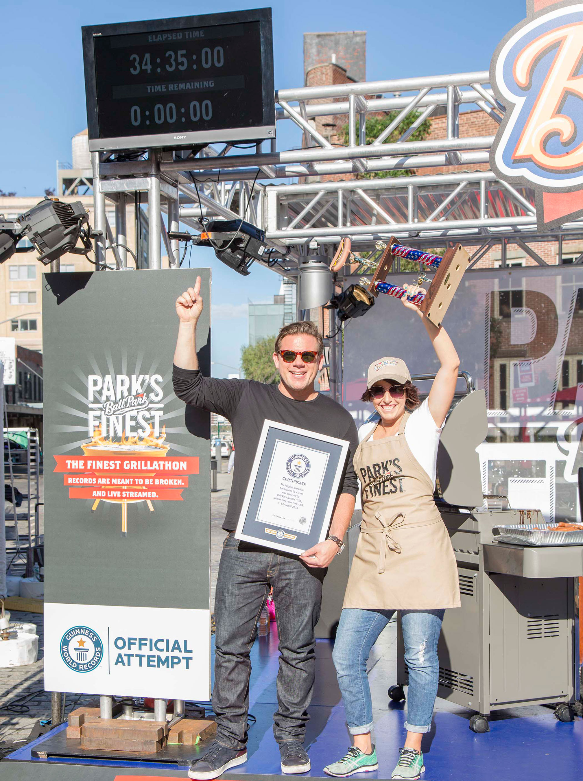 The Ball Park brand grill team, comprised of Andrew Battistelli of Clinton, TN and Susan Bulloch of Lehi, UT, were selected to participate in the GUINNESS WORLD RECORDS challenge based on videos they submitted to The Finest Grillathon contest hosted by Ball Park brand and Food Network showcasing their all-star grill skills.
