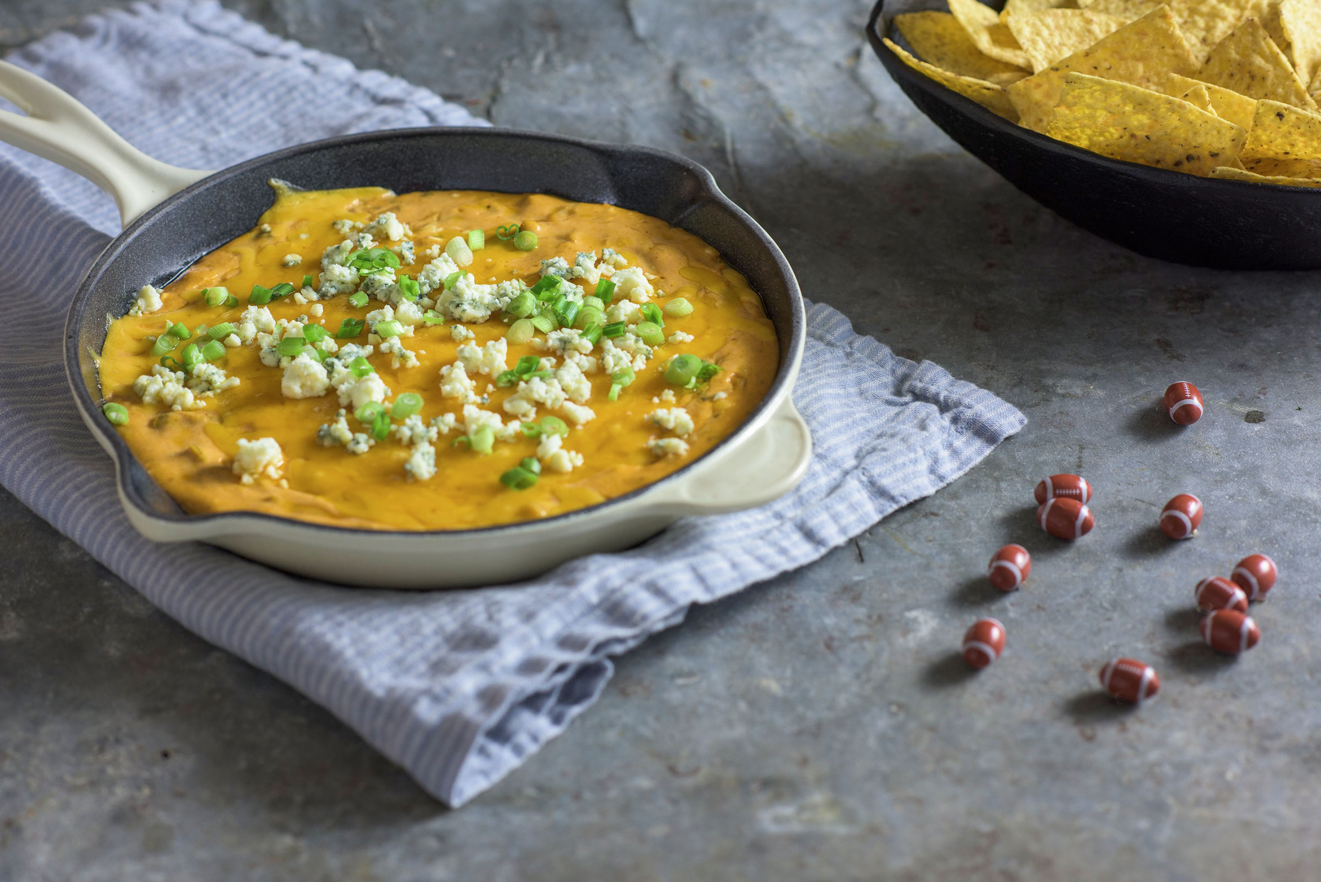 Next in the line-up, impress the team with Easy Buffalo Chicken Chili Dip. This recipe simply combines Southwest Style White Chicken with Chili Beans, cream cheese and cheddar cheese melted and poured into baking dish. Top with more cheese and bake until cheese is melted. For a finishing touch, top with blue cheese and onions and serve with your favorite tortilla chips.