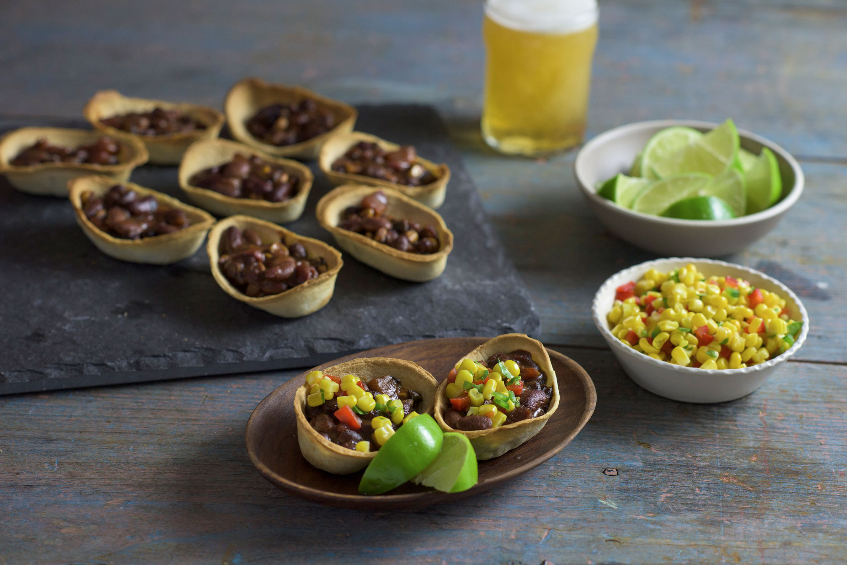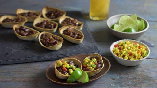 During half-time, change it out with something a little more substantial. Vegetable Chili Mini Boats are fun and flavorful. Fill mini taco boats with Roasted Vegetable Chili with 3 Beans and bake. Top with a colorful corn relish made of corn, red bell pepper, jalapeno, cilantro, fresh lime juice.