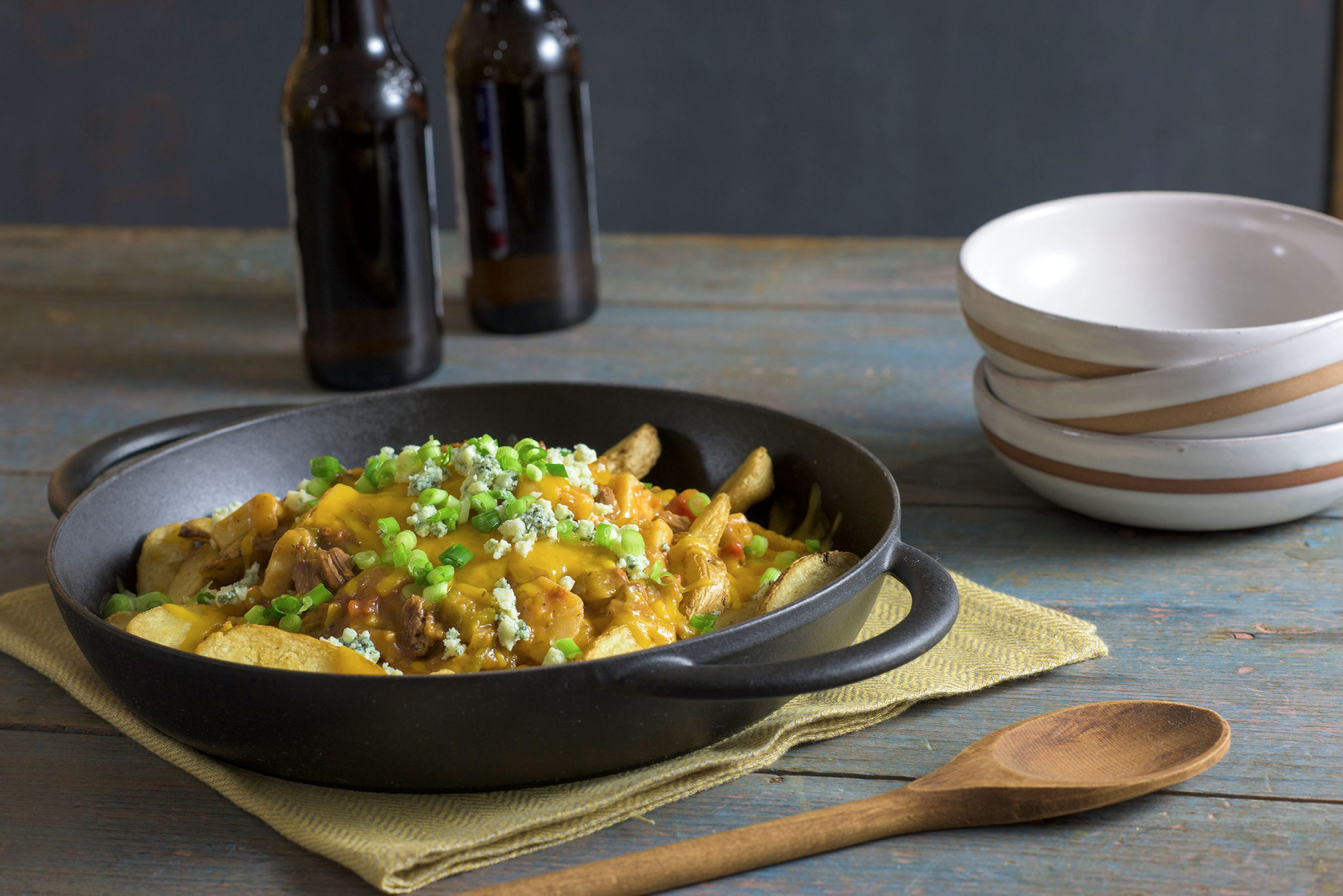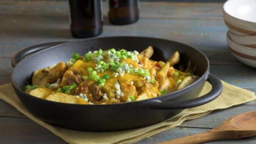 For a twist on a hearty meal to serve the family during a busy week, Hearty Stew Pub Fries are sure to please. Top cooked potato wedges with a layer of cheddar cheese, Hearty Vegetable Stew with Beef and another layer of cheddar cheese and bake until melted. For a final touch, top with blue cheese and green onions. This will fill the family and is quick and easy.