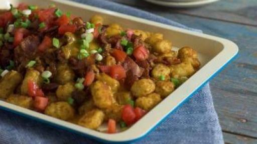 For a sit-down occasion to feed a group, Chili Tachos make for a hearty meal the family will love. Mound baked Tater Tots™ on a pan, sprinkle cheddar cheese on the tots, pour chili over it, top with another layer of cheese and bake until melted. Add some crunch and top with chopped cooked bacon, tomatoes and green onions.