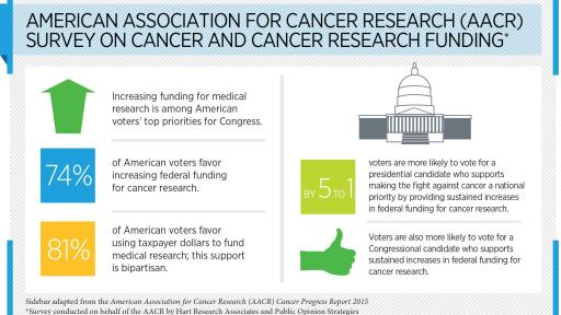 “We have made spectacular progress against cancer, which has saved the lives of millions of individuals in the United States and around the world,” said Margaret Foti, PhD, MD (hc), chief executive officer of the AACR. “However, without increased federal funding for cancer research, we will not be able to realize the promise of recent discoveries and technological advances. Our national survey shows that this issue is a priority for most American voters, and the AACR is committed to advocating for increased federal funding for the lifesaving research that brings hope to cancer patients everywhere.”