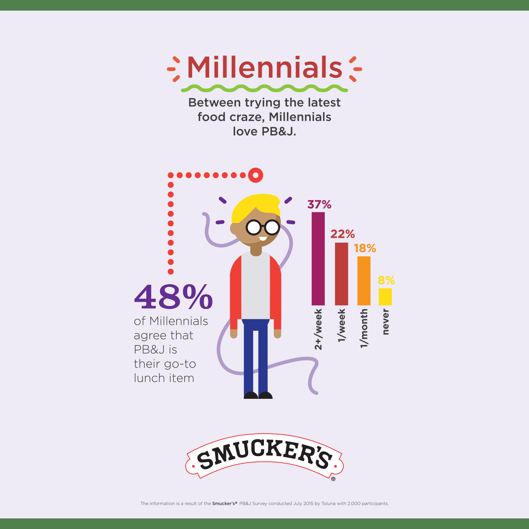 - Nearly 50% of millennials say PB&J is their go-to lunch item, with 37% eating a PB&J sandwich more than two times per week.