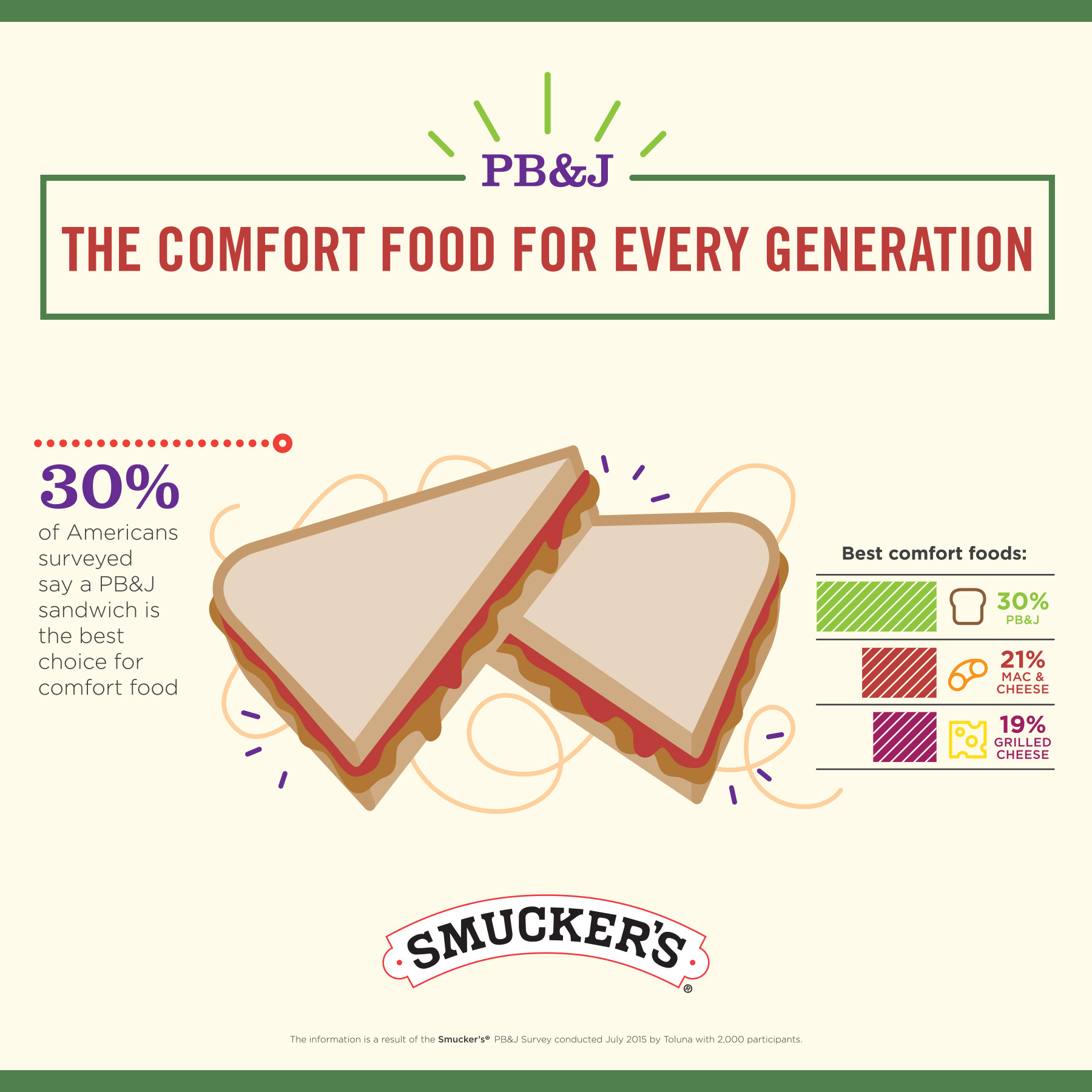 ORRVILLE, Ohio (October 15, 2015) – A Smucker’s PB&J Survey, conducted by Toluna1, reveals that PB&J sandwiches are a timeless classic. The survey found that one-third of surveyed Americans (30%) chose PB&J sandwiches as their favorite comfort food over mac and cheese (21%) and grilled cheese sandwiches (19%).