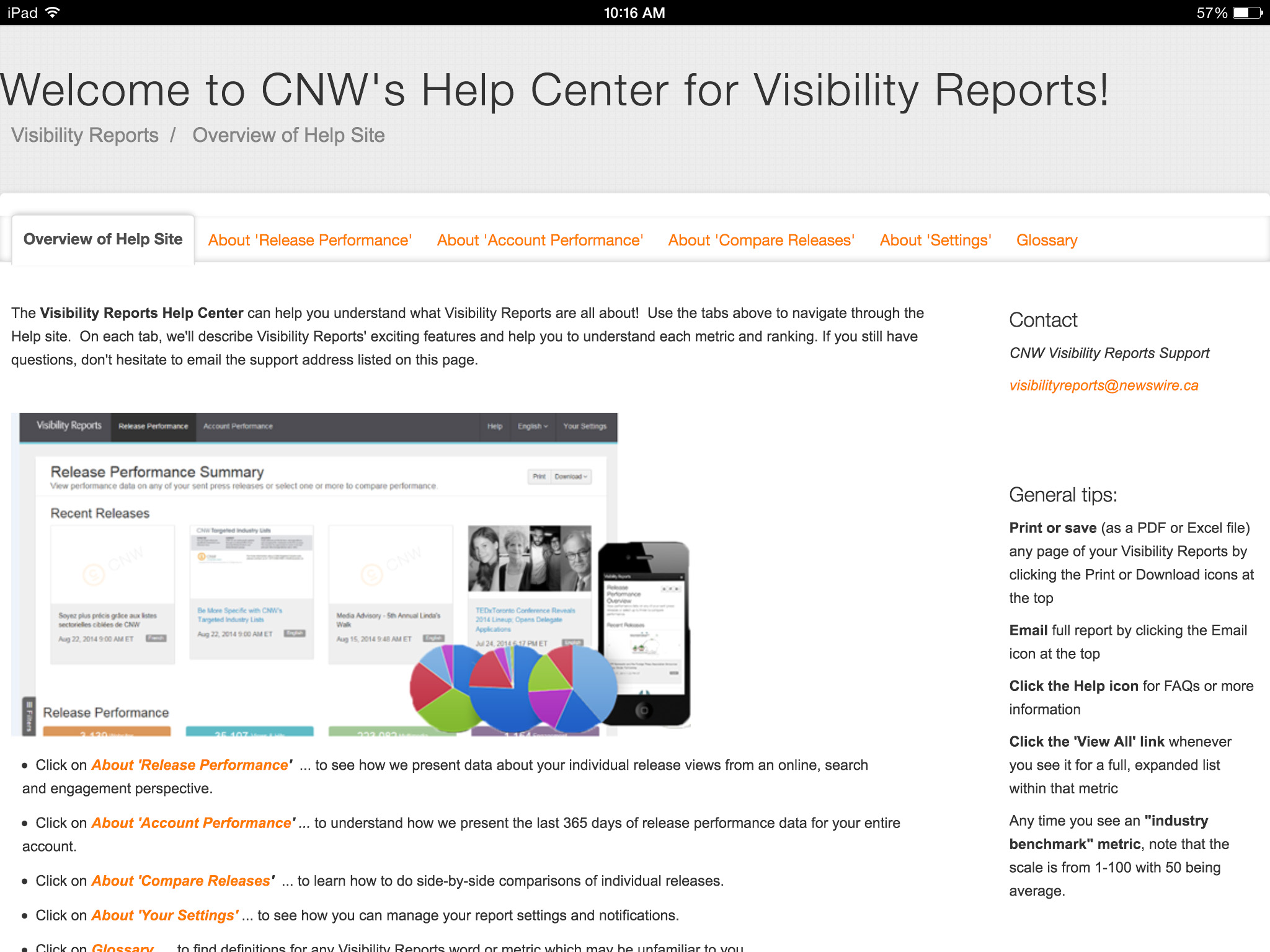 CNW’s Visibility Reports provide clients with a strategic overview of their communication programs by allowing them to view and export analytics and compare news release performance against industry benchmarks. Get news release results such as traffic, audience demographics and engagement in real-time, anytime with clear and effective charts and graphs.