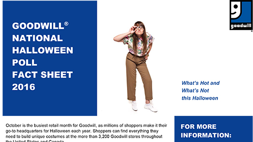 For costume inspiration, visit Goodwill’s Halloween website, which features a costume generator, makeup video tutorials and a locator to find your nearest Goodwill store. Visit www.goodwill.org/halloween. To access the Halloween Poll fact sheet, visit http://bit.ly/GWHalloweenPoll.