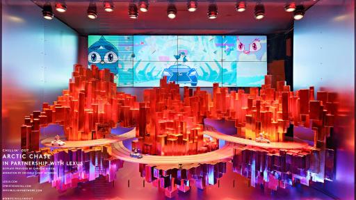 Beginning with the idea of the penguin, the Barneys New York team partnered with Lexus to reimagine a traditional and playful winter racetrack adventure. The Barneys CHILLIN' OUT - themed holiday window features three penguins surfing atop dazzling, crystal-encrusted Lexus IS, GS F and RC F model cars racing around a track commissioned and created by renowned slot car track designer Gary Gerding. With visual cues informed by ZSL London Zoo's Lubetkin Penguin Pool and action reminiscent of childhood games, a one-minute animated narrative brings the full scene together. Using traditional animation, CG, pixel, glitch effects and a custom music score, the stylized animation, “Stay Cool,” tells the story of a penguin hero racing against his opponents, set to an imaginary world of ice formations, city structures, and ski lodges.