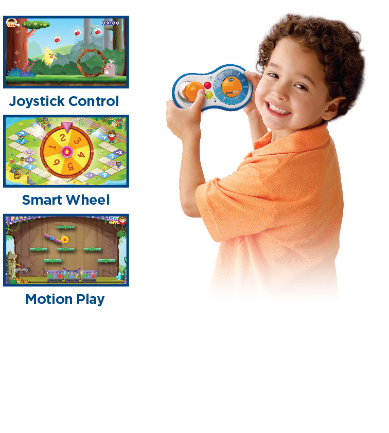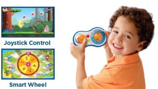 The kid-friendly controller is perfectly sized for small hands, with special styling that makes it easy to use by both right- and left-handed kids. It offers a simple design for children developing fine motor skills, making it easier for them to manipulate than game controllers traditionally found on adult gaming consoles. The controller features a joystick, smart wheel and motion control so children can tilt and shake it to play select games. The smart wheel allows for even more engaging play experiences built into the games, such as the thrill of spinning a number wheel in the multi-player board game to find out how many spaces you can move.