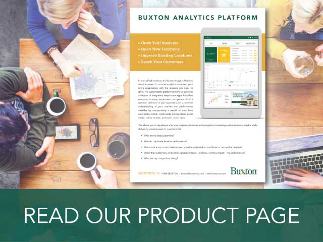 “This cutting-edge platform is the future of the customer analytics industry,” said Tom Buxton, founder and CEO of Buxton. “With applications tailored to the needs of executives, analysts, real estate and marketing professionals, the platform truly unites organizations with a central view of their most important asset: customers. Buxton’s continued investment in new applications for the platform will fuel a constant stream of innovative analytics products designed to provide our clients with the answers they need to grow their organizations.”