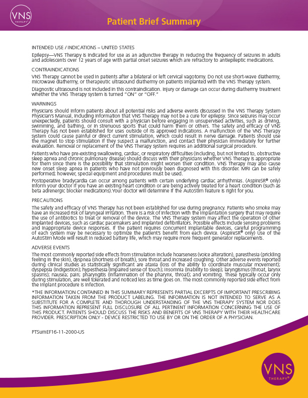The VNS Therapy system is a minimally invasive option in which a medical device is placed under the skin in the upper chest area during an outpatient procedure. The device sends mild electrical pulses through the vagus nerve to areas of the brain known to be associated with seizures. The new AspireSR generator takes the VNS Therapy technology a step further – detecting relative heart-rate increases that are often associated with seizures in people with epilepsy and providing responsive stimulation in an attempt to stop and shorten seizures and improve recovery.1