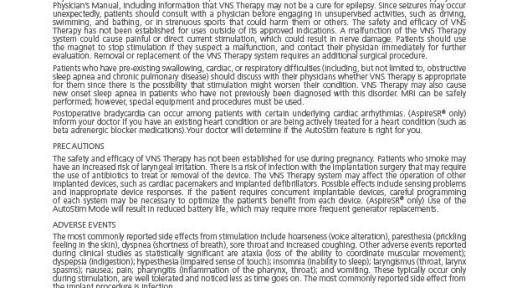 AspireSR has demonstrated safety and tolerability comparable to currently available VNS Therapy. The AutoStim Mode is not recommended for patients being treated for cardiac arrhythmia or with a history of bradycardia. The most commonly reported side effects from stimulation include hoarseness (voice alteration), paresthesia (prickling feeling in the skin), dyspnea (shortness of breath), sore throat and increased coughing.