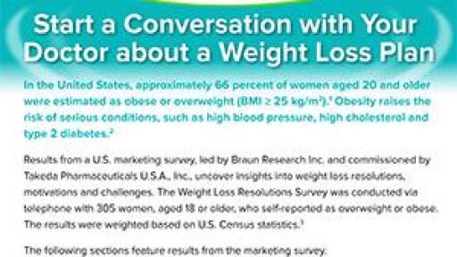 According to a U.S. marketing survey, led by Braun Research, Inc. and commissioned by Takeda Pharmaceuticals U.S.A., Inc., of women who self-reported as overweight or obese, when asked if they have ever made a New Year’s resolution to lose weight, 72% of women said, “Yes.”3 In addition, 60% of these overweight or obese women actively worked to achieve their New Year’s resolution to lose weight for only 1-4 months. When asked who they turn to for support during their journey to lose weight, only 4% of women surveyed said they turn to their doctor.