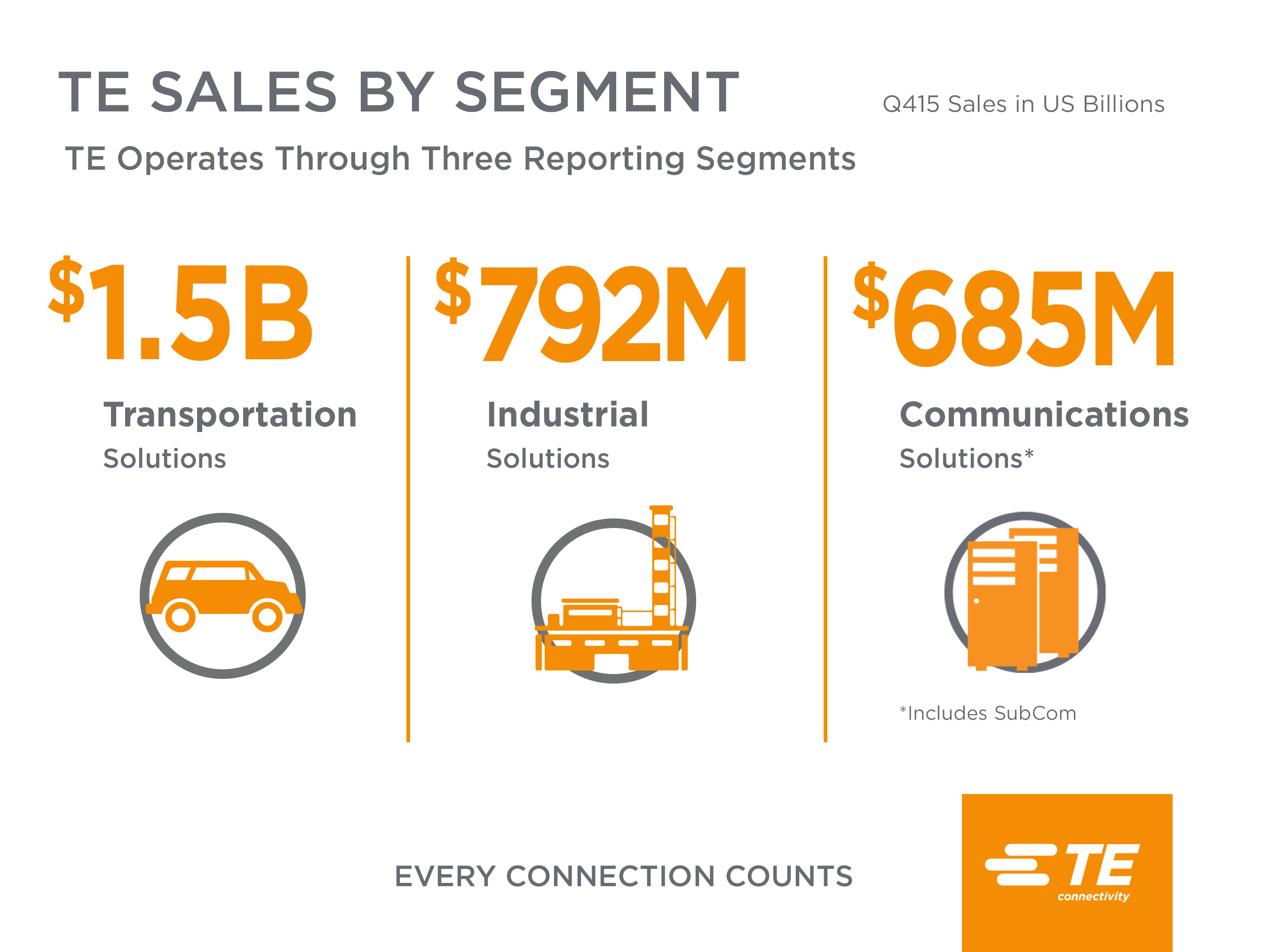 “In fiscal year 2015, we made good progress on our strategy,” said Lynch. “We completed four acquisitions, strengthening our leadership position in harsh environment solutions and establishing a leading Sensors business. We also sold our BNS business for $3 billion and are returning the vast majority of proceeds to shareholders. We ended the year with 80 percent of our portfolio focused on harsh environment applications, and 90 percent of our sales driven by connectivity and sensor solutions.