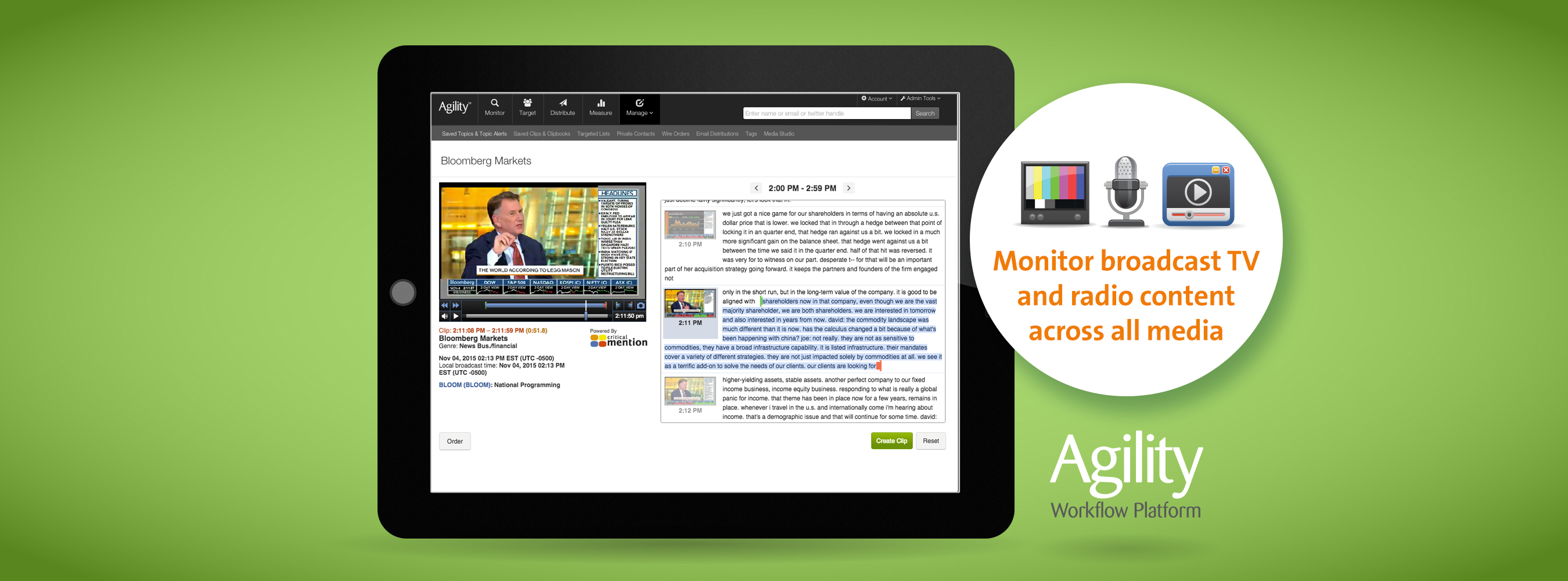 Critical Mention captures and indexes nearly 40 hours of broadcast content every 60 seconds from more than 2,000 unique broadcast sources across 8 countries, producing a robust database of more than 30 million searchable segments, all available in broadcast quality definition and in real-time. This integration of Critical Mention’s library of media clips allows Agility users to access and monitor brand mentions across every type of media – broadcast, online, social and print – all from within one platform.