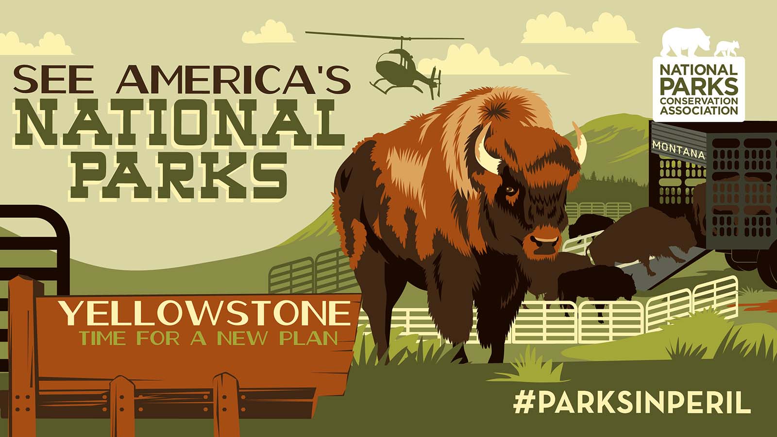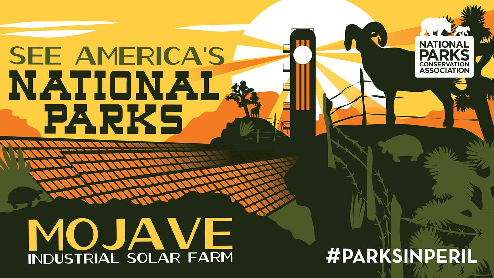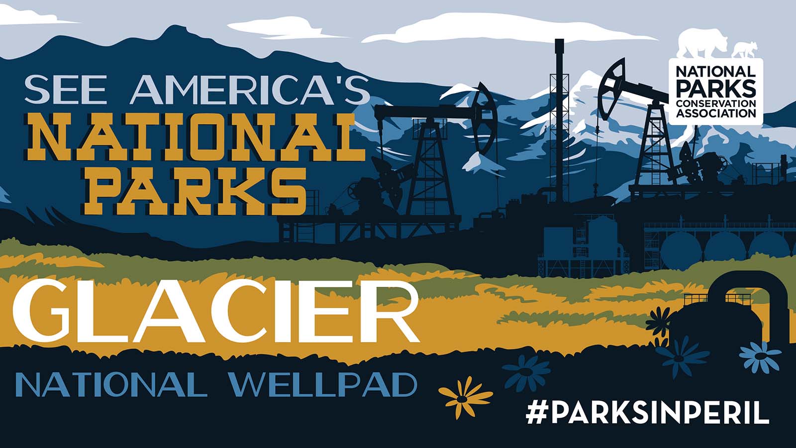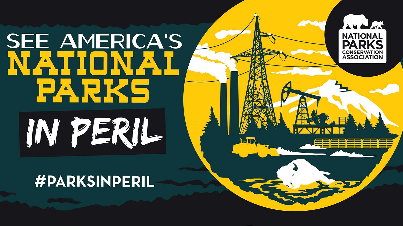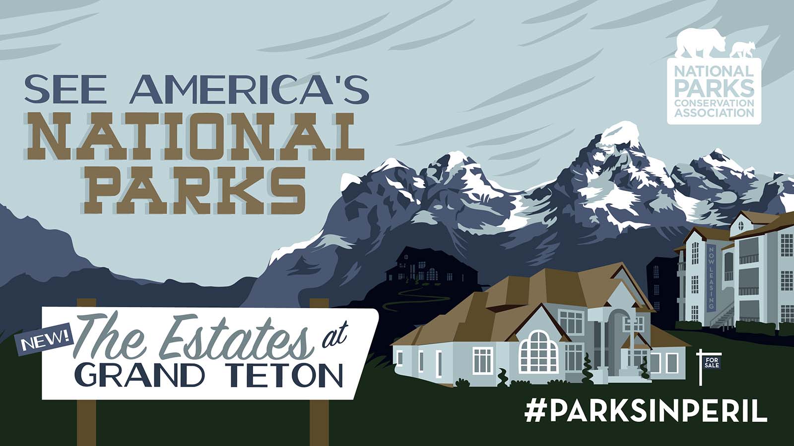 #ParksInPeril, featuring bold illustrations depicting the grim future our national parks could face if action is not taken, is available at npca.org/parksinperil.