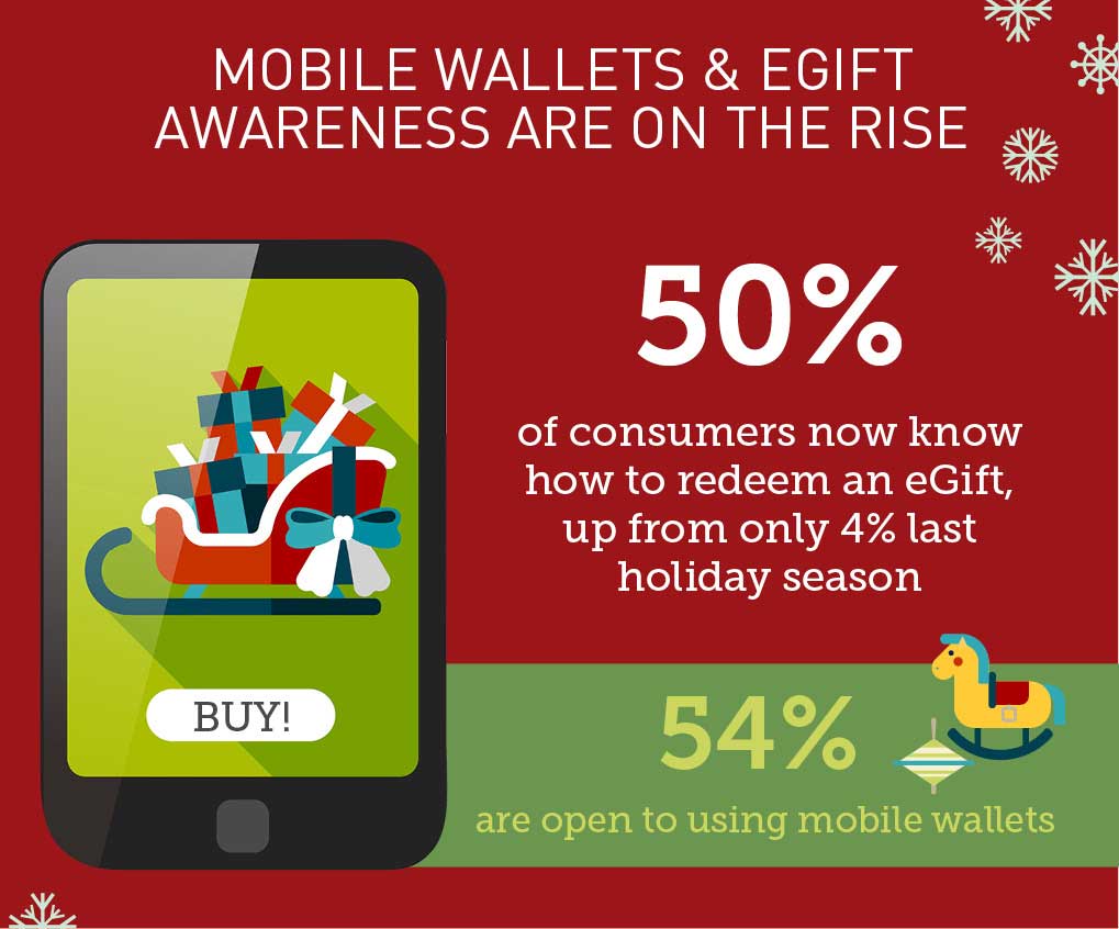 - Mobile wallets and eGift awareness are on the rise. Whereas last holiday season only 4% of consumers knew how to redeem an eGift card, 50% now said they know how. Additionally, a third of consumers are “very comfortable” using eGift cards and only 29% have never used one. Furthermore, less than half (46%) of consumers insist on using physical cards with the other 54% open to using mobile wallets, a 27% increase from last holiday season.