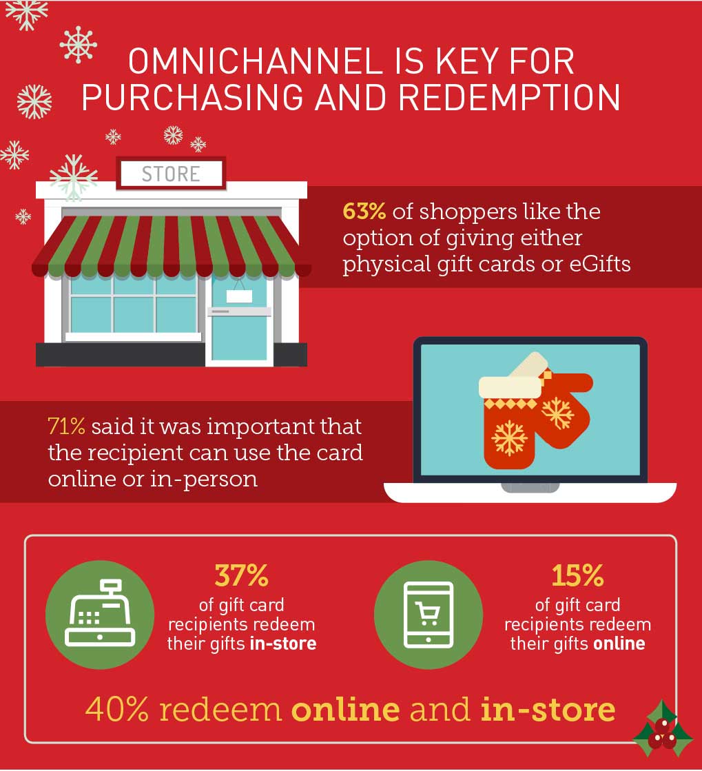 - Omnichannel is key for purchasing and redemption: 63% of shoppers like the option of giving either physical gift cards or eGifts, and 71% said it was important that the recipient can use the card either online or in person. Additionally 37% of gift card recipients are redeeming their gifts in-store, 15% online and 40% use a combination of both.