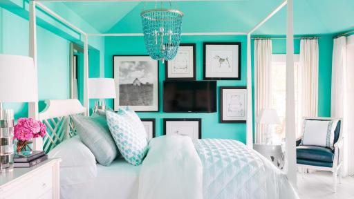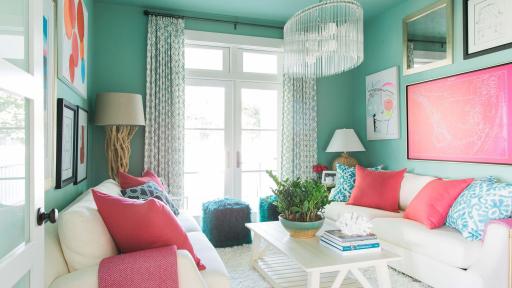 Bold punches of color against a backdrop of turquoise walls give this room a tropical vibrancy.