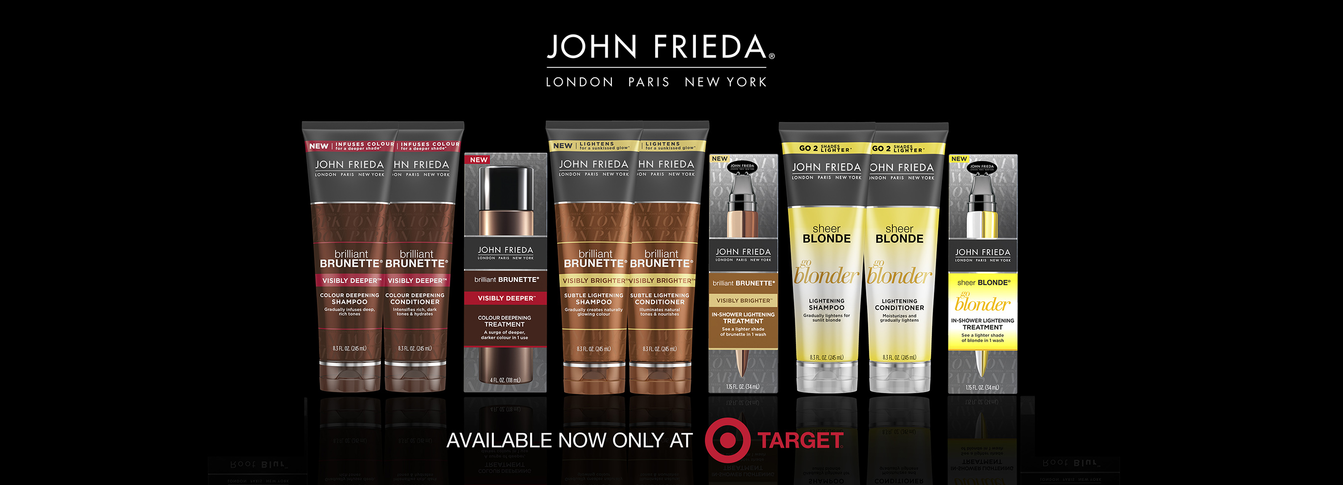 John Frieda® Hair Care They’re the kind of hair care innovations you dream about – products that let you wash in brighter or deeper tones in minutes, perfectly blur regrowth to give your colour extra mileage between touchups, and conjure up satiny-soft, air-dry waves you can run your fingers through. And while the majority of these products won’t be officially available until 2016, you can get these John Frieda® innovations online through a target.com presale event, starting today.