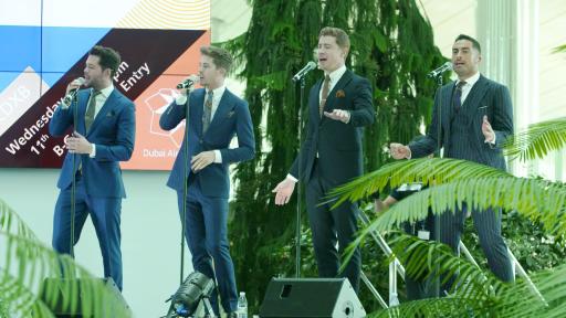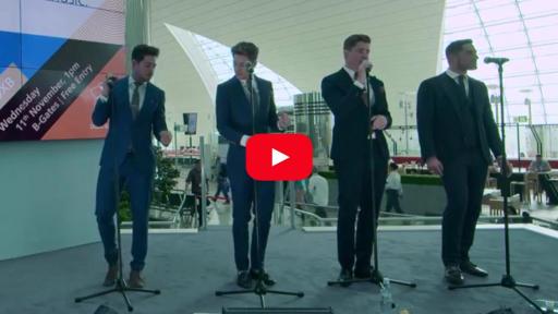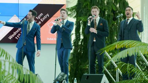 DUBAI - 12 November 2015 - Dubai Airports launched its revolutionary new initiative musicDXB in fine style yesterday as ‘Britain’s Got Talent’ finalists and the UK’s new swing kings Jack Pack lit up the world’s largest stage for the first time during a 30-minute pop up concert that entertained and engaged passengers at the world’s #1 international airport Dubai International (DXB).