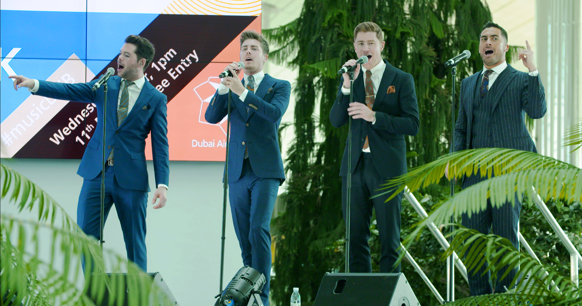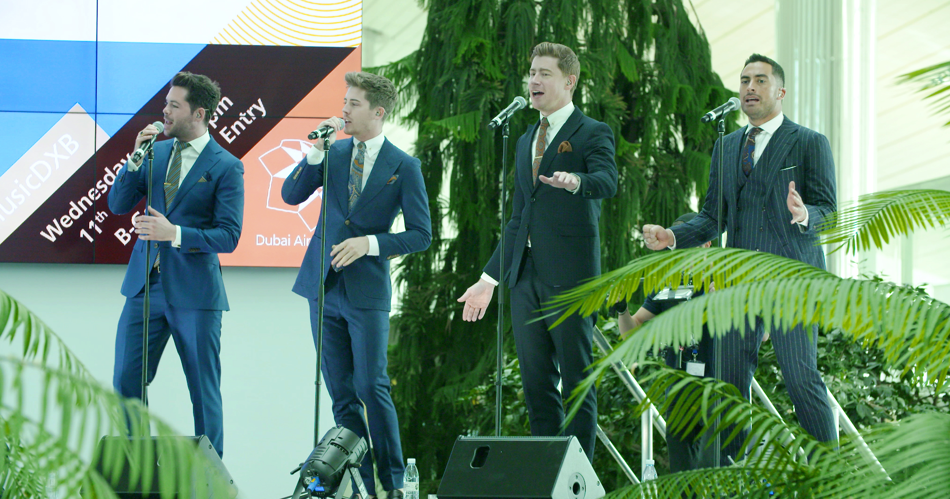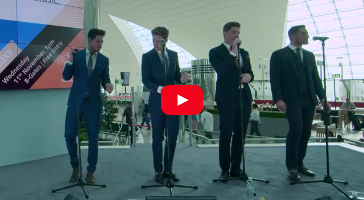 DUBAI - 12 November 2015 - Dubai Airports launched its revolutionary new initiative musicDXB in fine style yesterday as ‘Britain’s Got Talent’ finalists and the UK’s new swing kings Jack Pack lit up the world’s largest stage for the first time during a 30-minute pop up concert that entertained and engaged passengers at the world’s #1 international airport Dubai International (DXB).