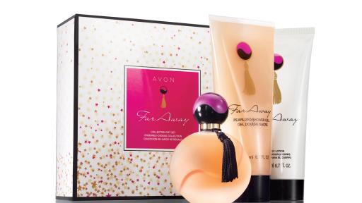 - Avon Far Away Collection Gift Set ($20.00): Inspired by exotic landscapes and distant shores, this spicy floral scent transports the wearer to a faraway world. This striking kit includes a 1.7 oz eau de parfum, a 6.7 oz body lotion, and a 6.7 oz shower gel, allowing her to experience the atmosphere of a remote land in the comfort of her own home.