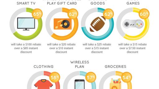 - Millennials choose higher-value rebates over instant discounts across shopping categories: For categories including electronics, entertainment, sporting goods, clothing, wireless plans and even groceries, the majority of millennials would choose a higher-value rebate offer over an instant discount.