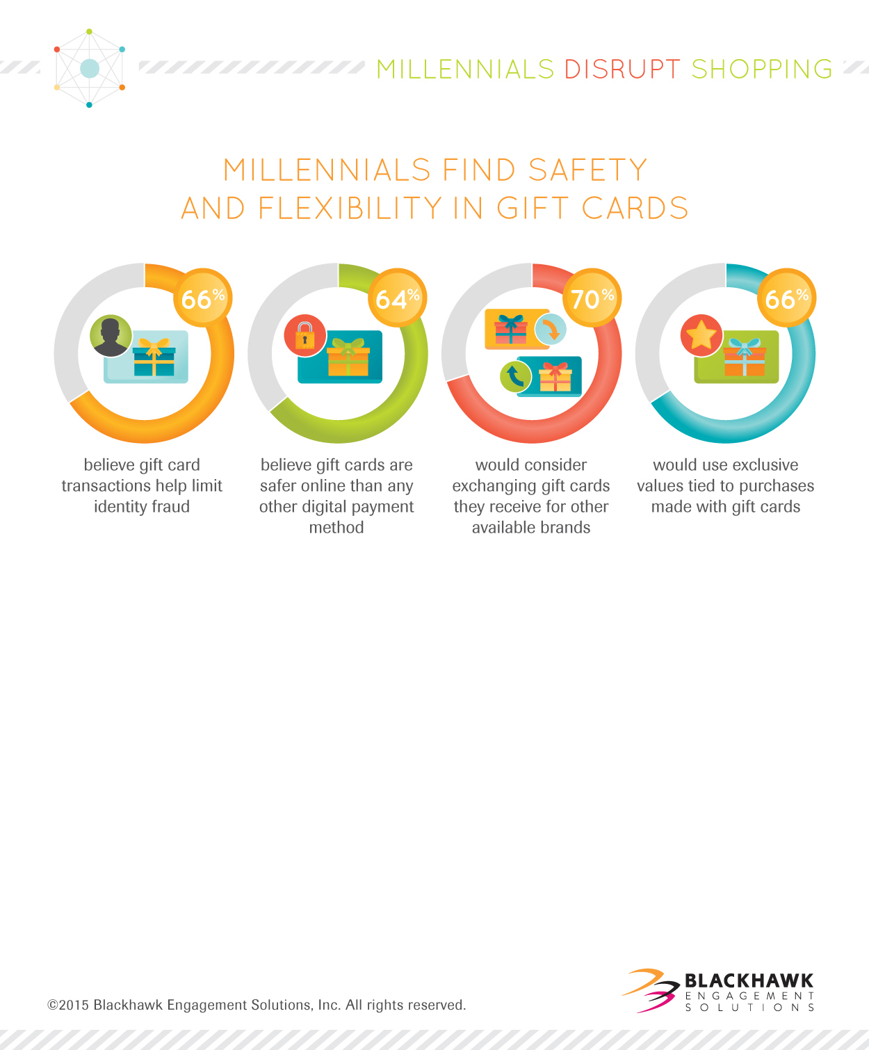 - Gift cards believed to be safest for online shopping: 64 percent of millennials believe that gift cards are safer to use online than any other digital payment method. Sixty-six percent believe gift cards limit identity fraud.