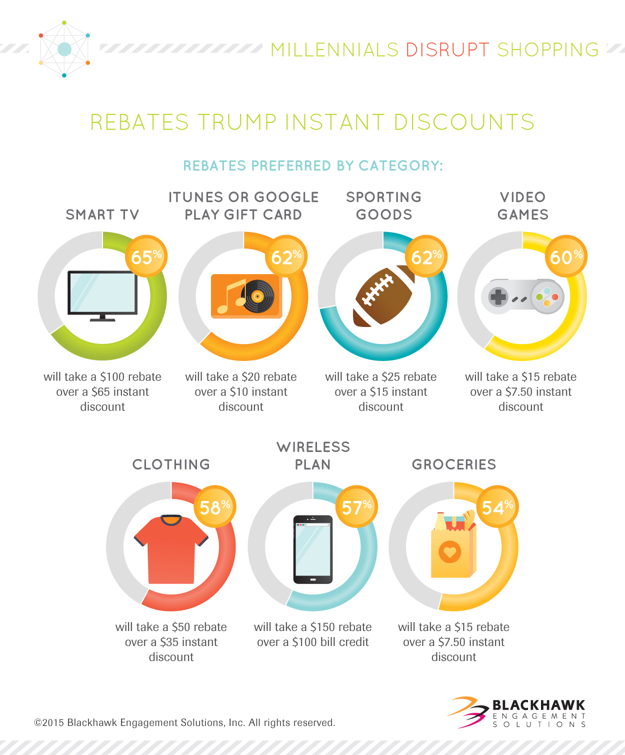 - Millennials choose higher-value rebates over instant discounts across shopping categories: For categories including electronics, entertainment, sporting goods, clothing, wireless plans and even groceries, the majority of millennials would choose a higher-value rebate offer over an instant discount.