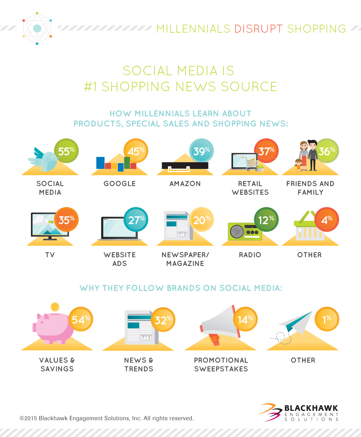 - Social media is #1 for shopping info: Social media is millennials’ primary source for shopping news and discovering new products; TV is #6.