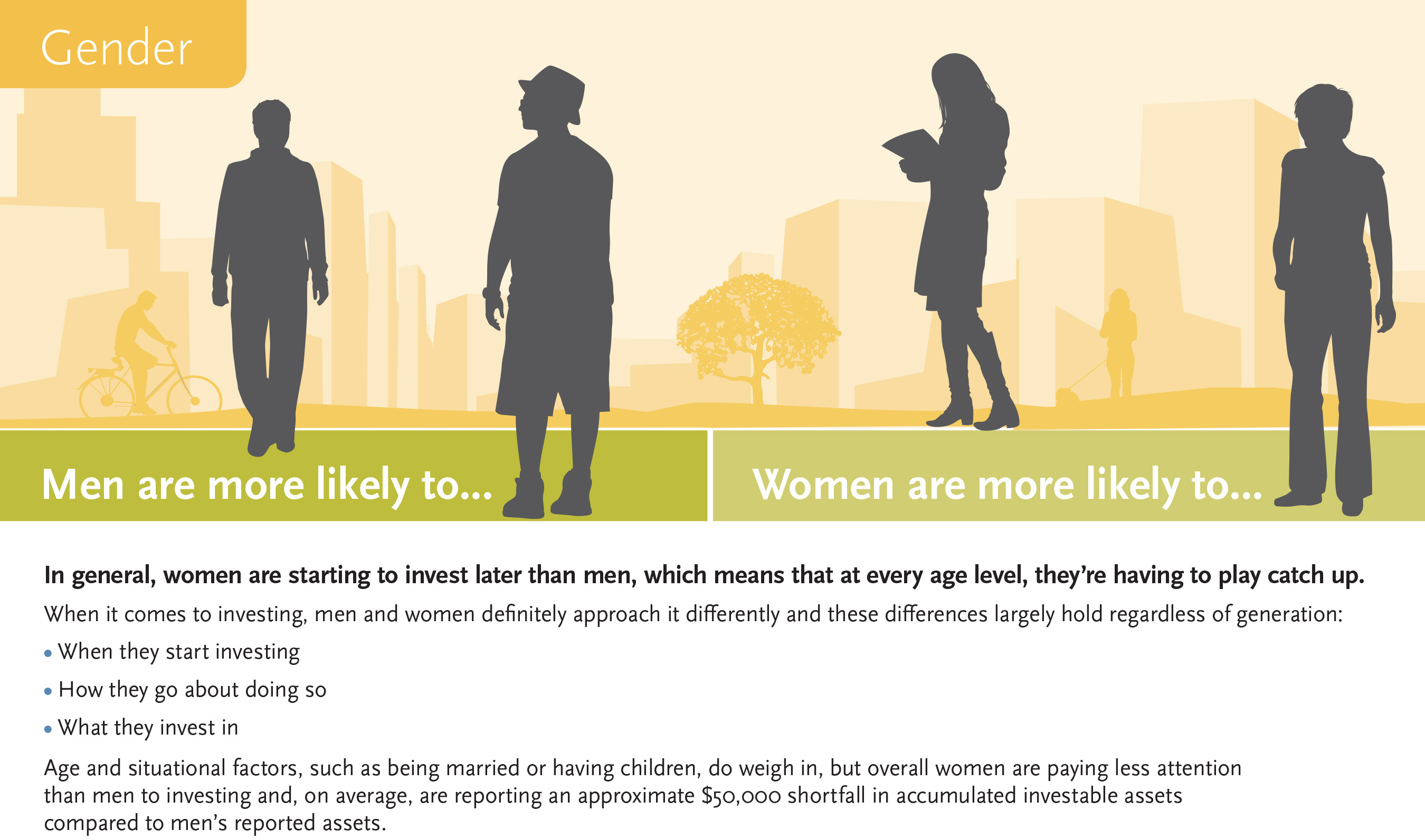 - Before choosing an investment, men are more likely to read websites/blogs/posts online, while women look to trusted sources such as parents/grandparents and their financial advisor