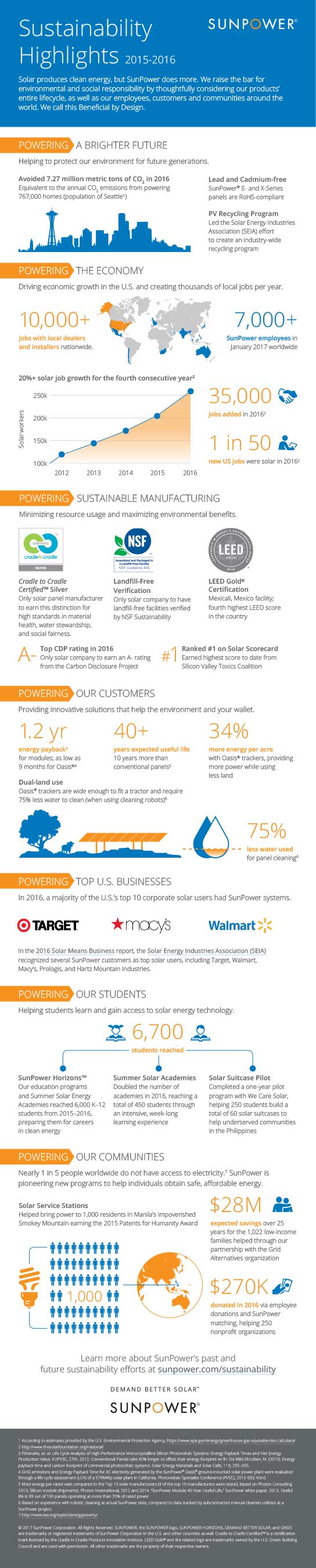 SAN JOSE, Calif., March 29, 2017 – According to Advanced Energy Economy, 71 of Fortune 100 companies set renewable energy or sustainability targets at the end of 2016. And with seven of the top 10 U.S. companies as customers, SunPower (NASDAQ:SPWR) knows firsthand the growing market need for an experienced, trusted solar advisor to help corporations efficiently and cost-effectively meet such goals. Released today, SunPower’s 2015-2016 Sustainability Highlights Report provides an overview of the company's own notable sustainability achievements, as well as its progress affecting sustainability-driven business practices in the solar industry and in corporations around the world.